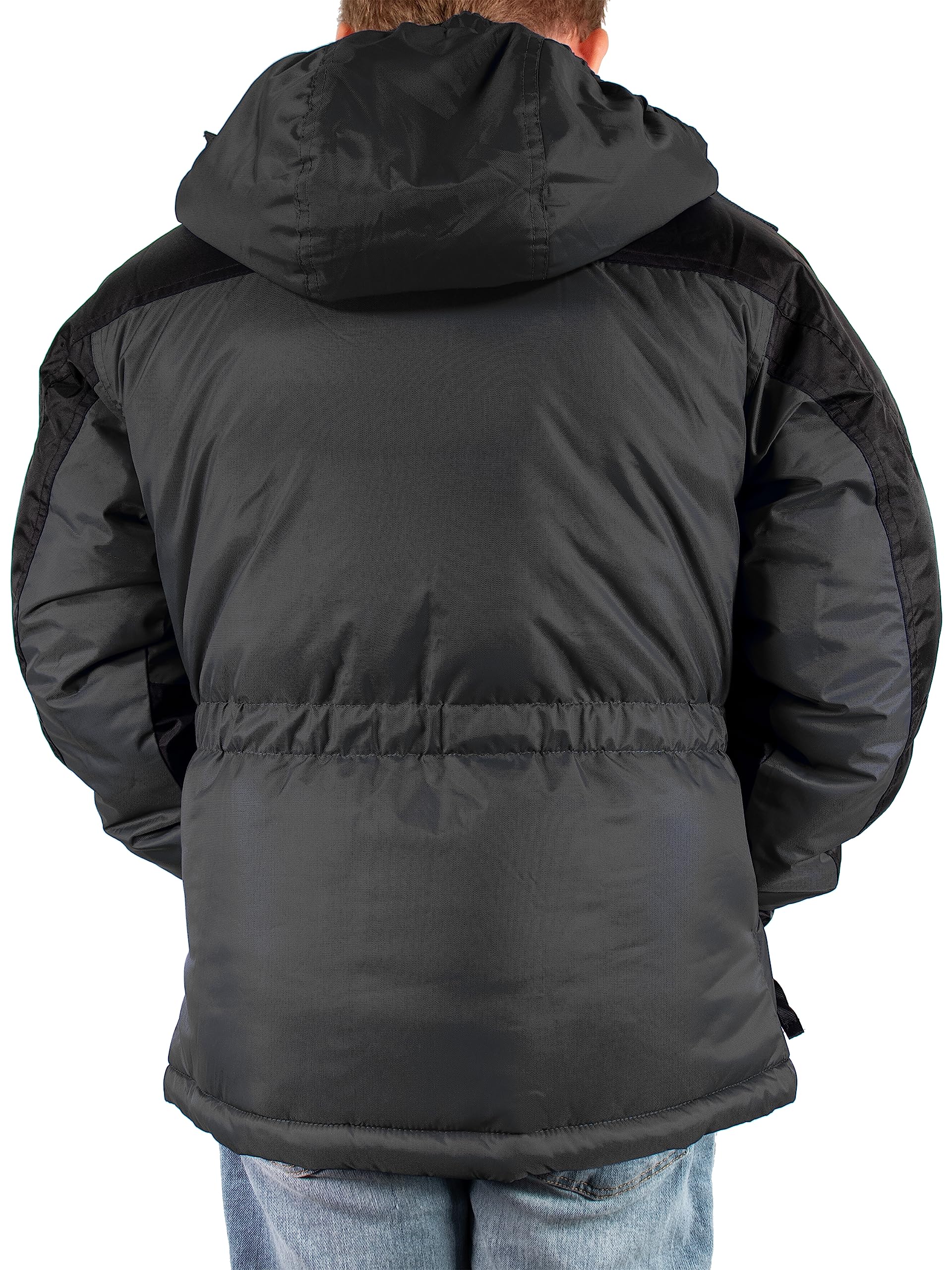 - 6 zippered pockets on coat, 4 pockets on vest. Insulated hood, removable by zipper.