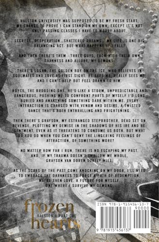 Frozen Hearts is a dark and seductive romance with multiple love interests that will grip your soul and leave you yearning for more. A dark, college, hockey, stepbrother romance. Frozen Hearts is the first book in the Halston U duet. This series does contain trigger warnings. Please see front of book for specifics.