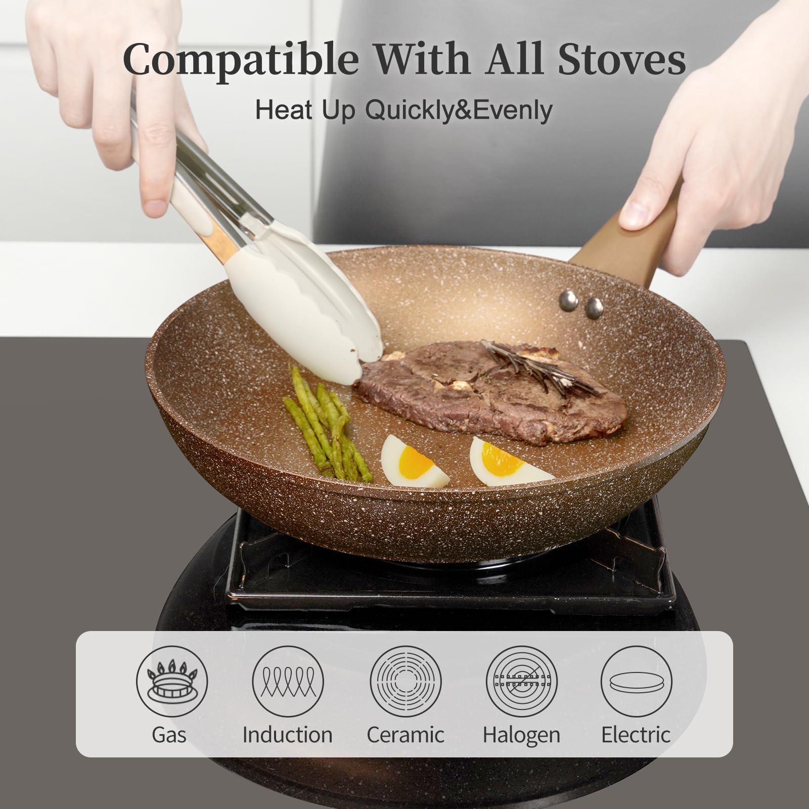- 【Compatible With All Stoves】The interior core of the pan set nonstick is made of professional grade aluminum alloy, the design of widened and thickened bottom, and thickened the wall of pan, ensure the frying pans nonstick heats up quickly and evenly, warp-resistance, cooks the authentic delicious foods. The high magnetic conductive stainless steel base used effectively on induction stovetop, gas stove top, electric cooker, glass cooktop and ceramic stove, made for any kitchen and cooktop
