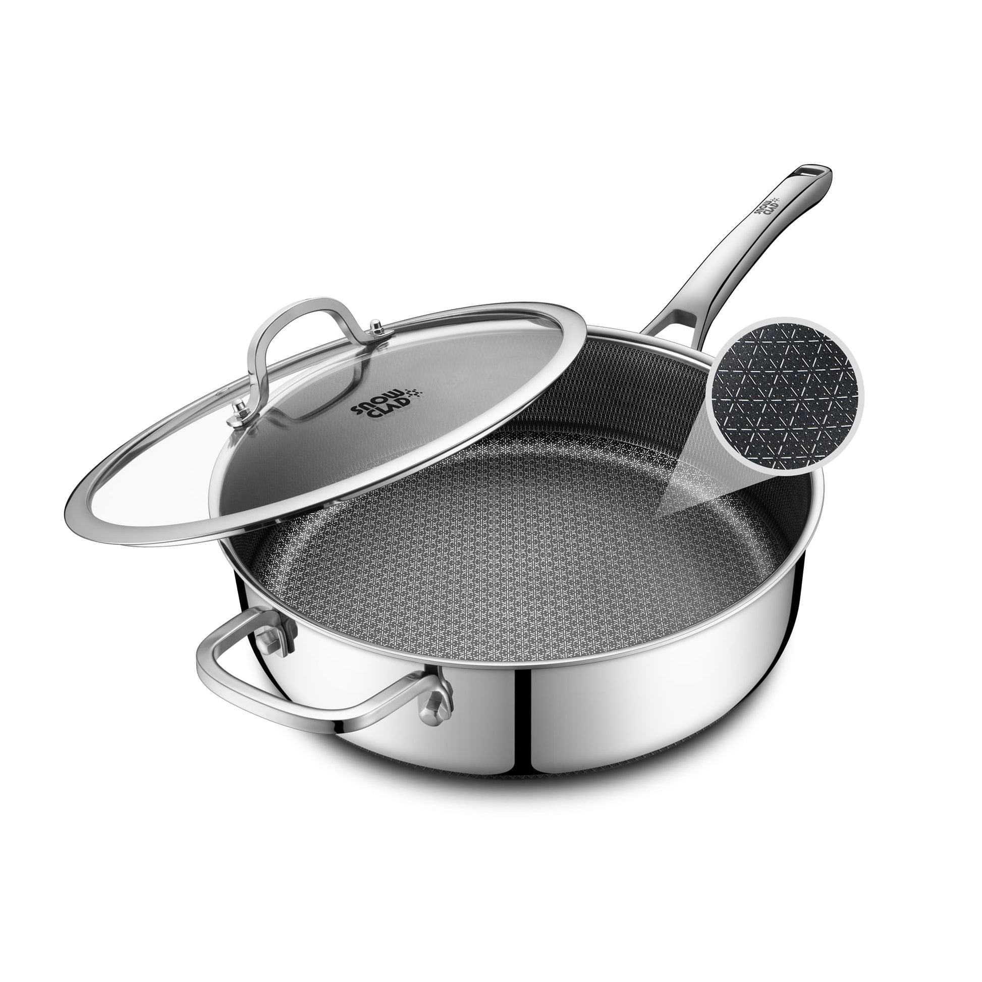 - 【SNOWFLAKE TECHNOLOGY】Our design is created through a laser etching process to provide both stainless steel and non stick surface. This dual surface allows to cook with less oil, grease, and butter.Our clad surface is 50% more than usual Hex surface non stick frying pans.