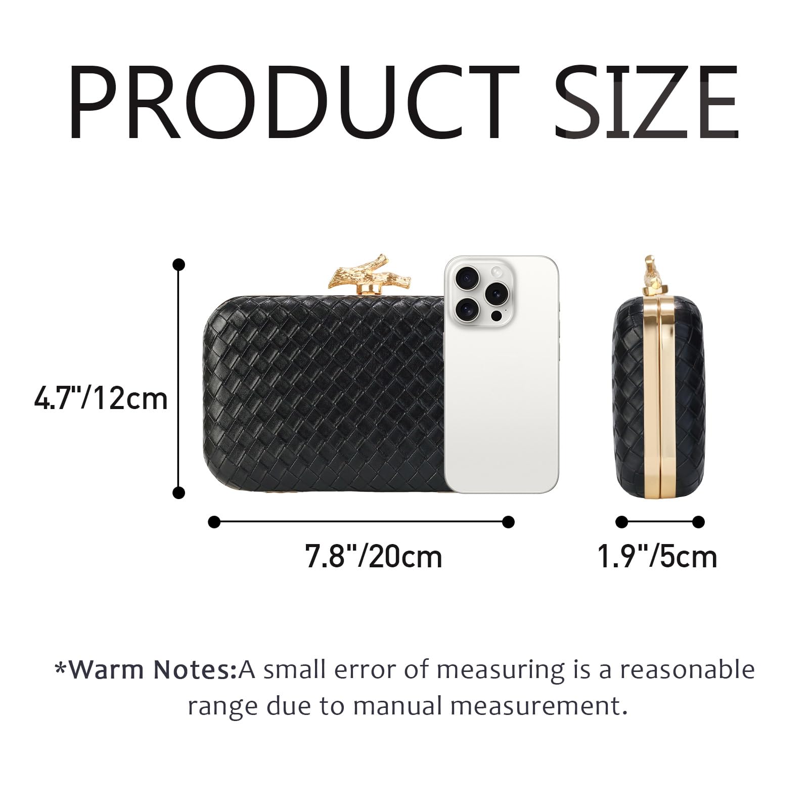 - Spacious Interior: Measuring 7.8' x 4.7' x 1.9'INCH/20 x 12 x 5 CM,Despite its sleek appearance, you can hold essential items like car keys, compact mirror, lipstick, mascara, and even an iPhone12 pro max
