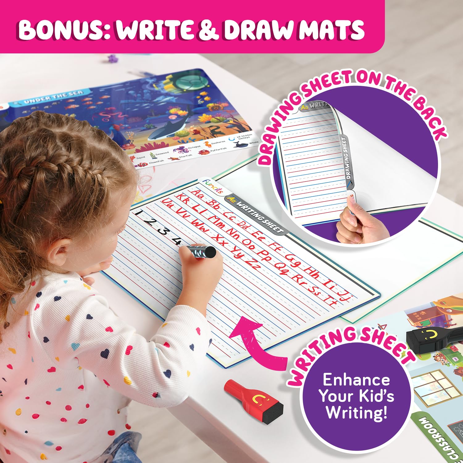 - BONUS! Learn to Write Mat - One side is a blank drawing board, perfect for artistic expression. The other side features a 3-line ruled board, ideal for practicing handwriting and early letter formation.