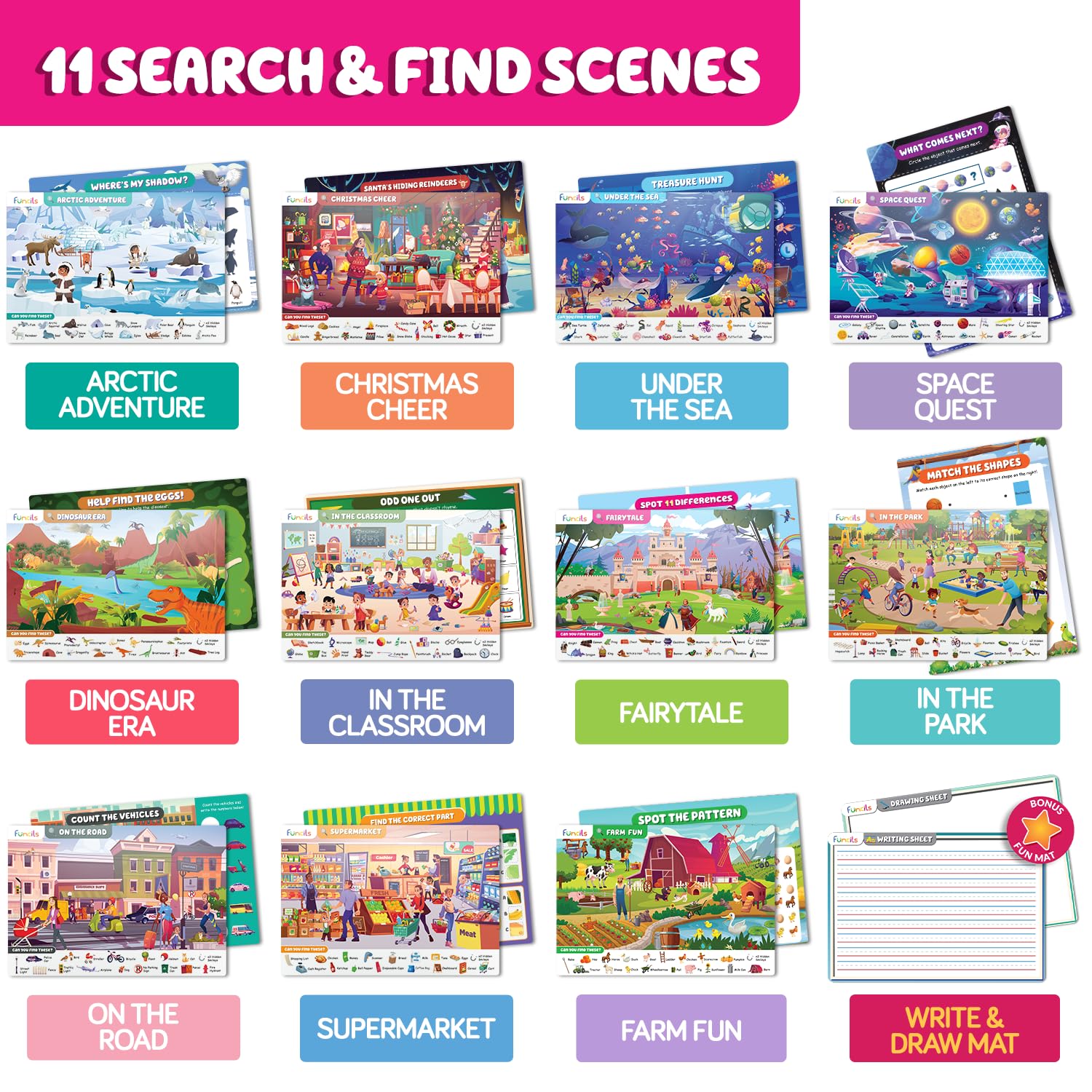- Fun Learning & Education Toys - 12 unique double sided search & find reusable activity mats (dry erase) (big size) with 22 repeatable toddler activities that help children build vocabulary while having fun!
