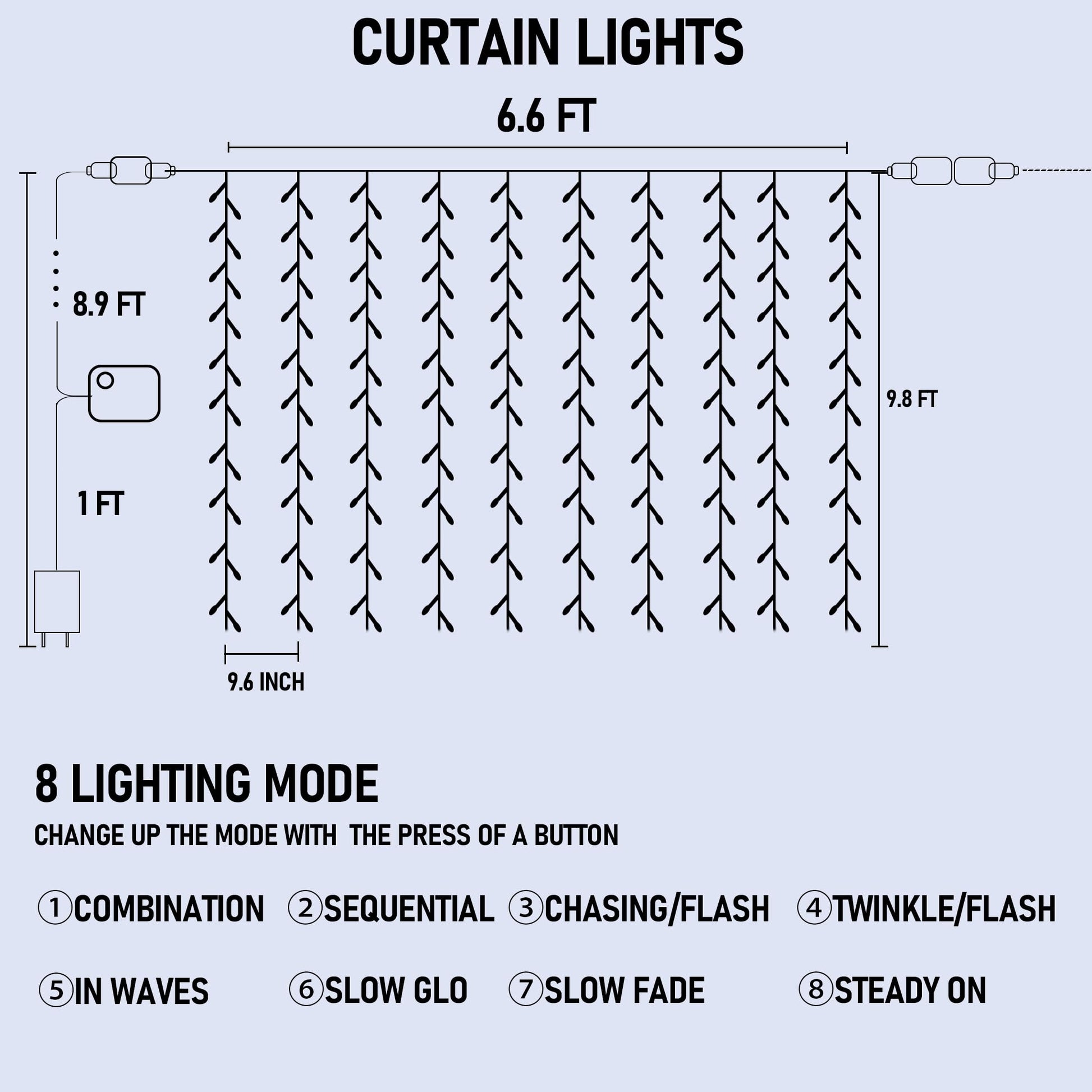 - 8 modes setting: Funpeny LED curtain string lights has 8 lighting modes(Combination, In waves, Sequential, Slow Glow, Chasing/Flash, Slow fade, Twinkle/Flash, Steady on). Beautiful and practical, multiple functions can meet your needs.