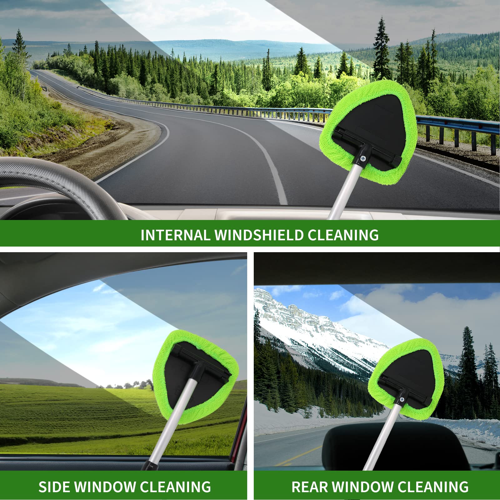 - Rotatable Car Windshield Cleaner: The car window cleaner with extra long extension handle designed with 180° pivoting& rotating triangular head-helps to provide better leverage, remove troublesome gunk in the corner of windshield. Comes with 3 removable microfiber pads and a 100ml spray bottle, soft microfiber never causes streaking after cleaning.