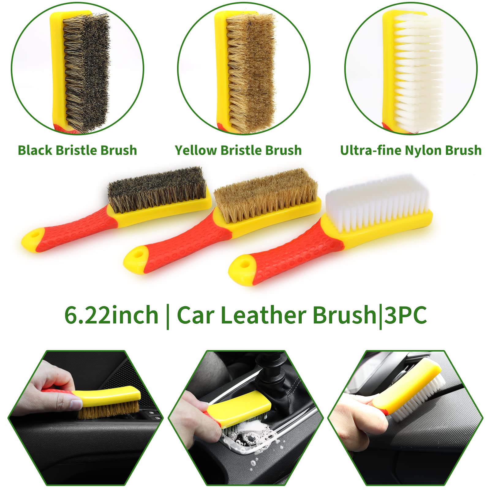 - Different Size Brush Tools: 5 different sizes of detail brushes meet all your detail needs, such as small gaps, corners, lug nuts, engine compartment, etc. Bristles are soft enough to protect the surface without leaving scratches on the paint.3 different hardness leather and textile car upholstery brushes for cleaning the car dashboard, wheels, foot mats, seats, air conditioning vents and other leather and textile materials.