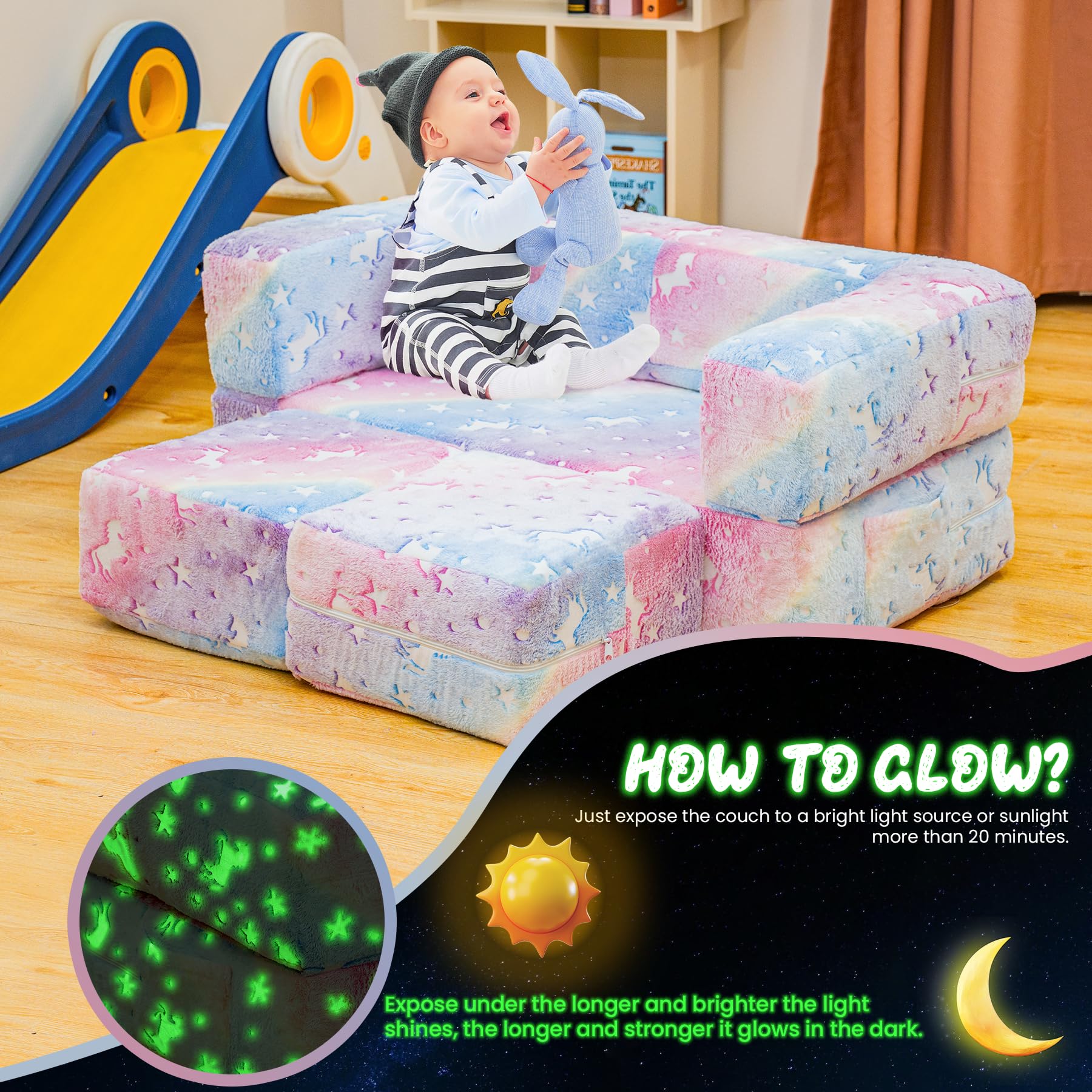 furlinkhm Modular Kids Play Couch, Glow in The Dark Kids Play Couch Toddler Couch,Kids Couch for palyroom, Convertible Baby Fold Out Play Foam and Floor Cushion for Bedroom (Rainbow+Unicorn)
