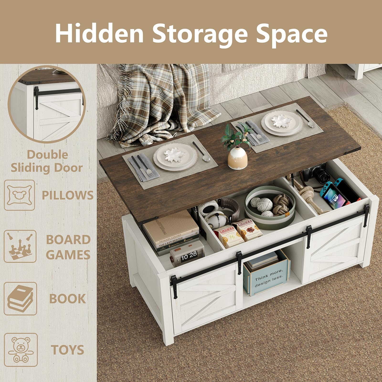 Furnihold 47.3'' Lift Top Coffee Table with Storage, Modern White Coffee Table with Sliding Barn Doors, Farmhouse & Rustic Rectangle Center Table for Living Room, Office, Brown Top