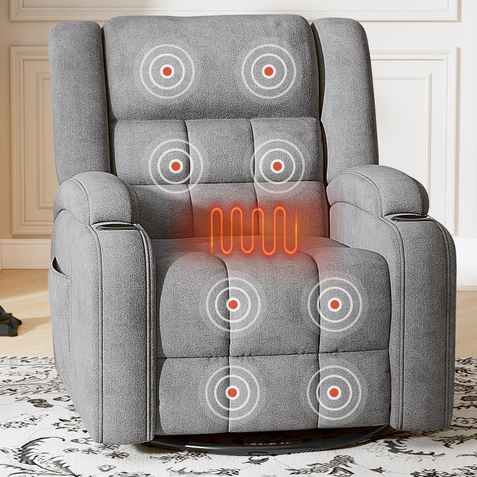 Furnimart 360° Swivel Rocker Recliner with Heat and Massage, Manual Comfy Recliner Chair for Adult, Chenille Glider Rocker Chaise Lounge for Living Room, Bedroom, Home Theater (Gray)