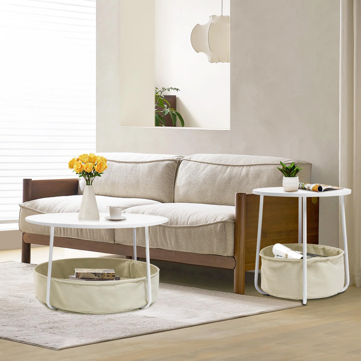 FurnitureR Coffee Table with Storage, 29.53 Inch Round Center Table 2-Tier with Fabric Basket, Sturdy Metal Frame, Modern Living Room Accent Table, White/Camel