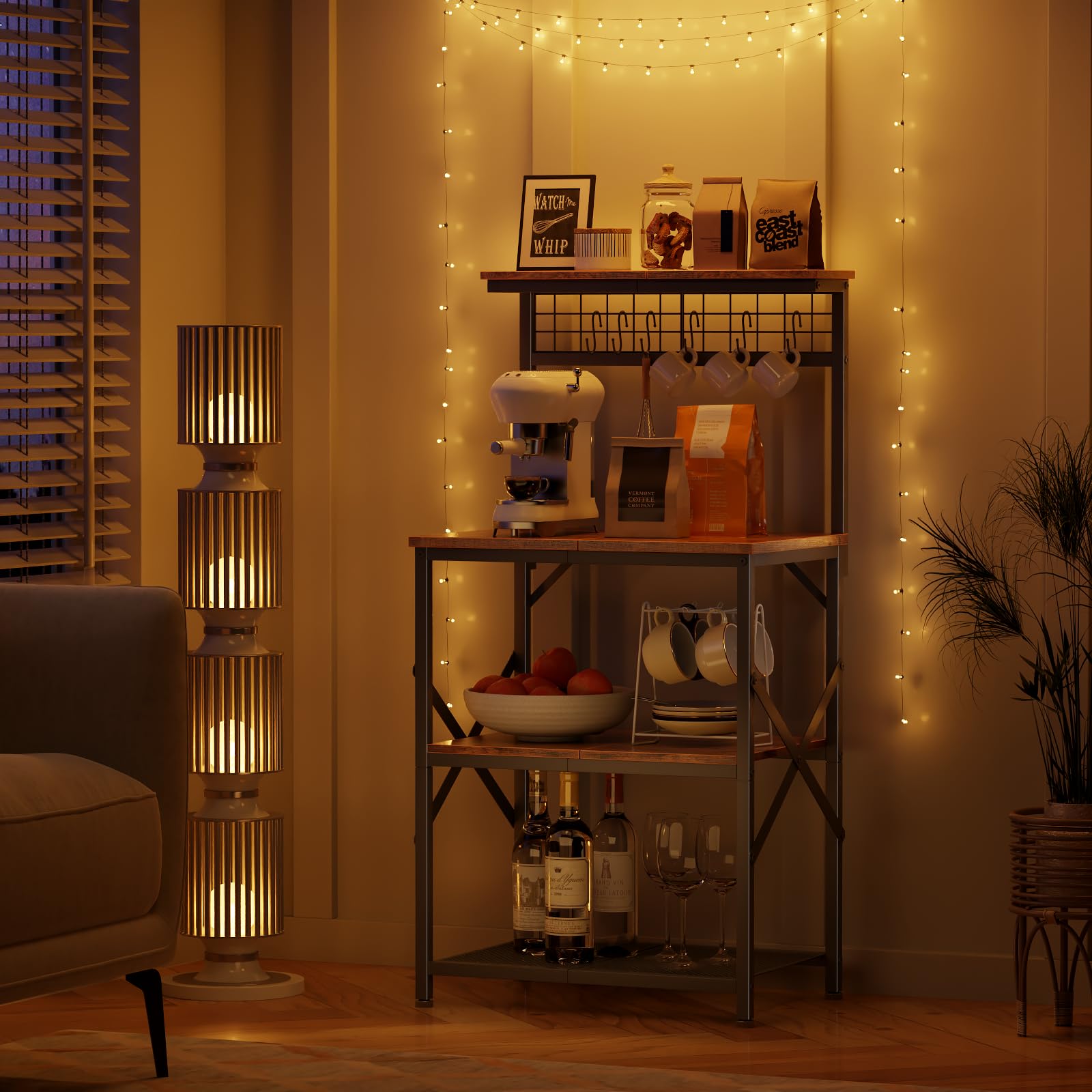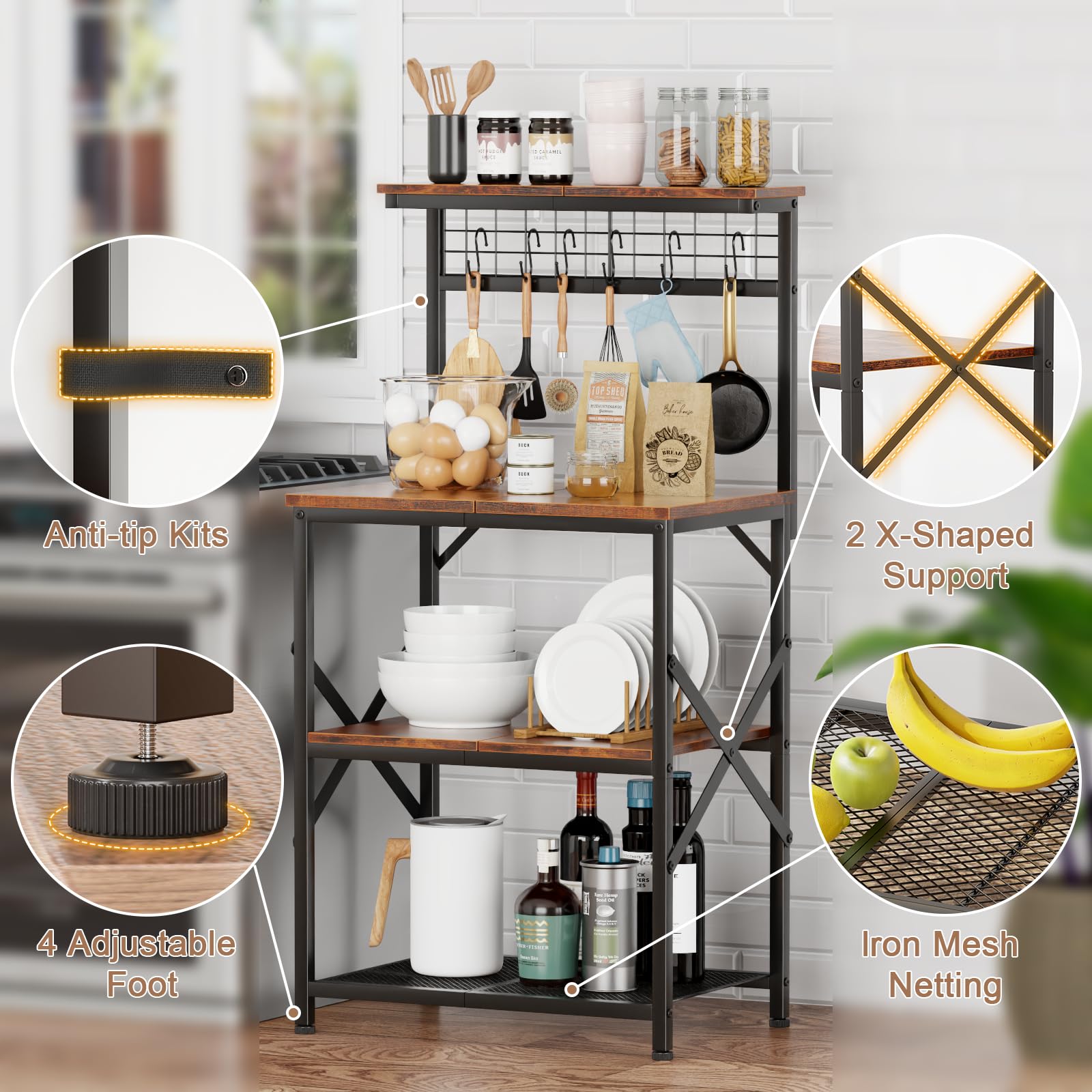 Furologee Kitchen Bakers Rack with Hutch, Coffee Bar Station 4 Tiers, Microwave Oven Stand with 6 S Hooks and Pegboard, Kitchen Microwave Rack for Spice Organizer Workstation, Rustic Brown