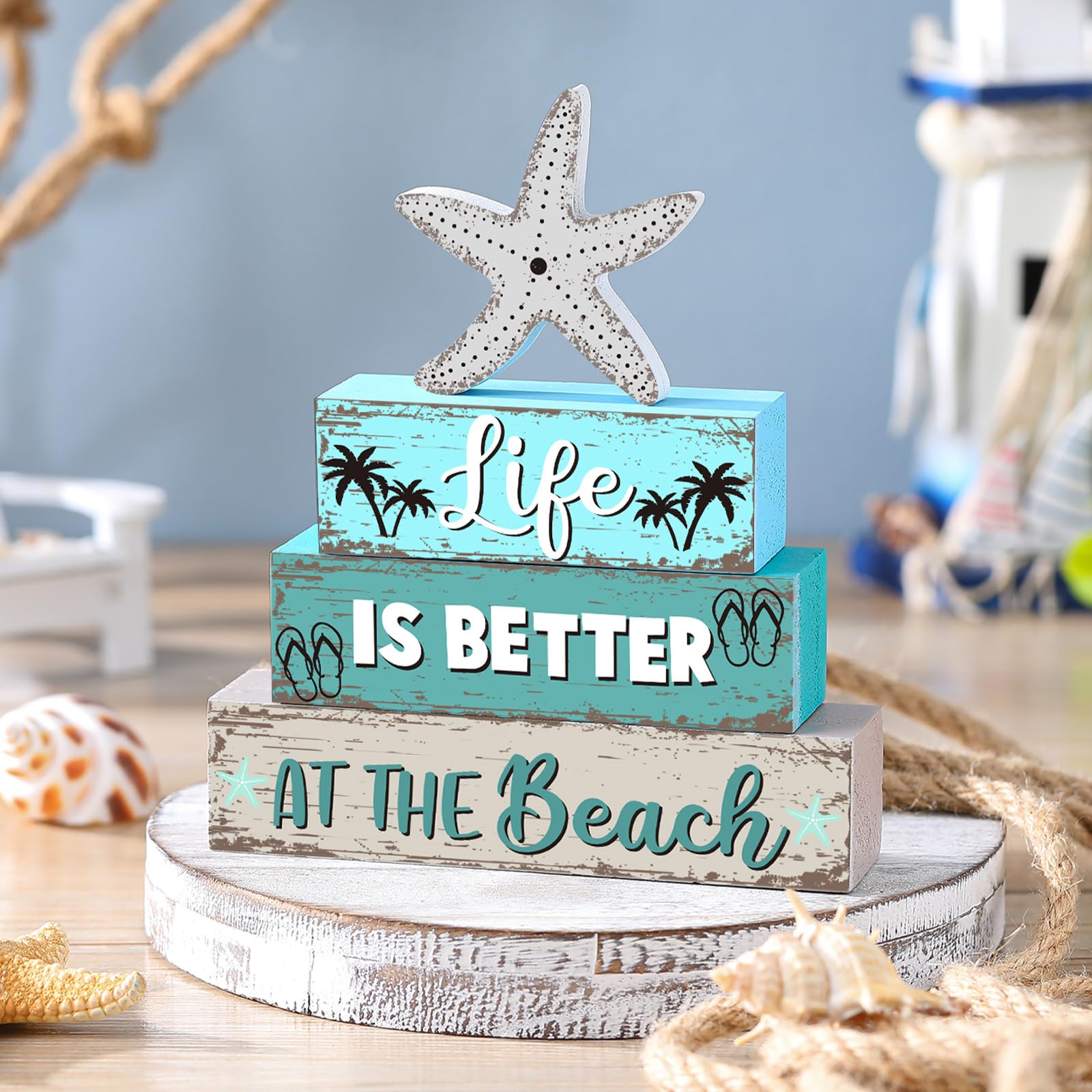 Geelin 4 Pcs Summer Table Decorations Ocean Life Better Wooden Block Signs Beach Theme Starfish Palm Slipper Tabletop Centerpieces Farmhouse Tiered Tray Decor for Home Table Kitchen Shelf
