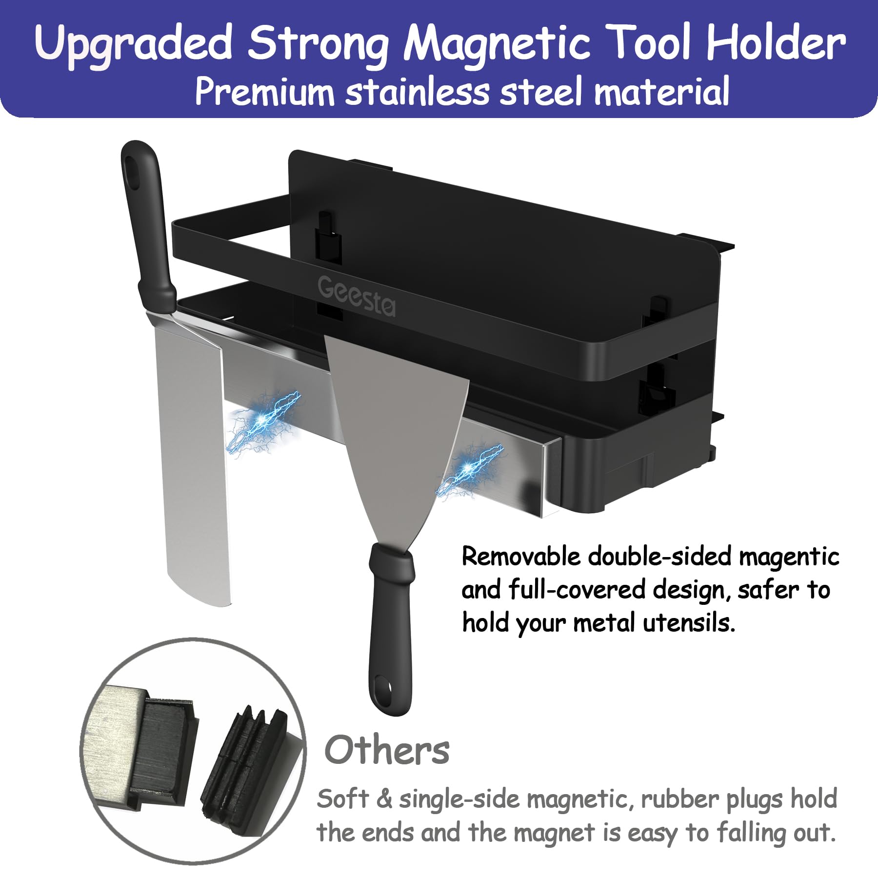 - 【Upgraded Full-covered Magnetic Stripe】Stop dropping your grilling tools! Our griddle caddy uses removable strong magnetic stripe to securely holds your metal utensils, provide better placement for grill accessories, like scrapers, spatula, tongs etc. Unlike the others, it‘s double-sided magnetic and fully enclosed, there is no rubber stoppers to hold the ends, so you don't have to worry about the magnets falling out of the bars. The super strong magnet is such a game changer!