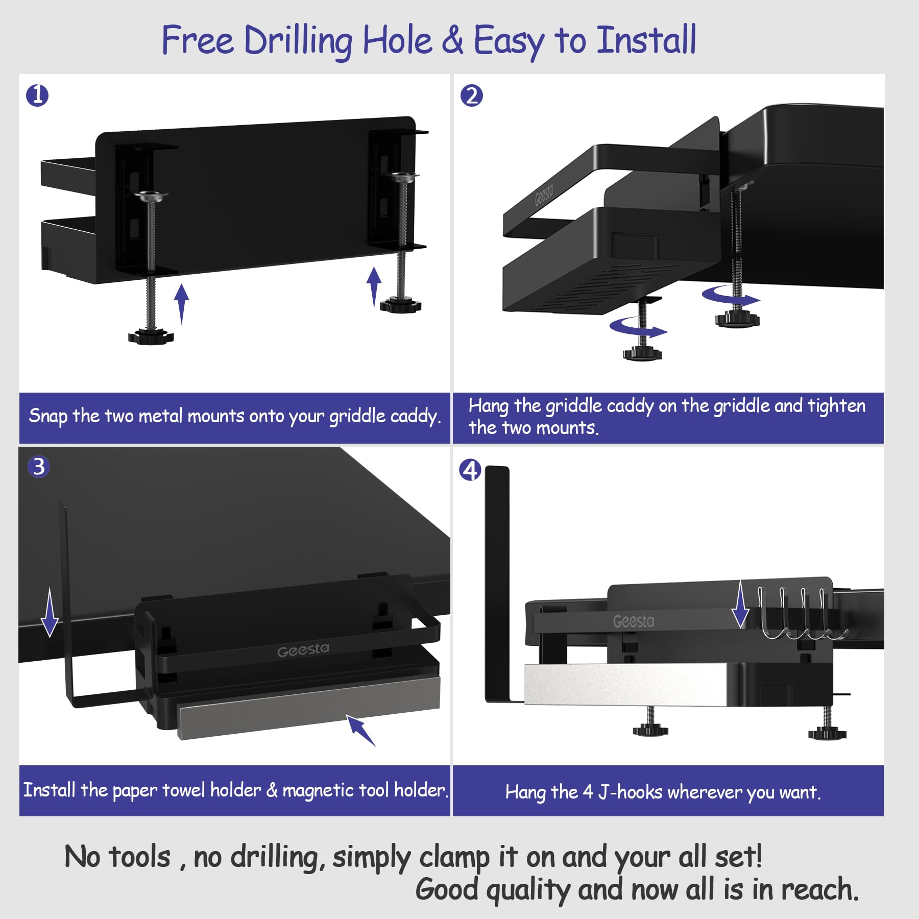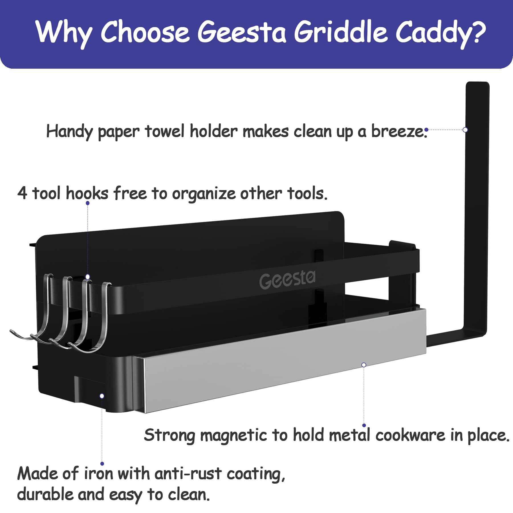 - 【High-quality Antirust Material】Our blackstone caddy is made of premium thickened iron with an antirust coasting which is easy to clean, durable and well made with enough depth and width. For anyone with a Blackstone grill looking to enhance their grilling setup, this caddy is a fantastic choice. If you have trouble with Geesta griddle caddy or any installation problem, please feel free to contact us Geesta service team.