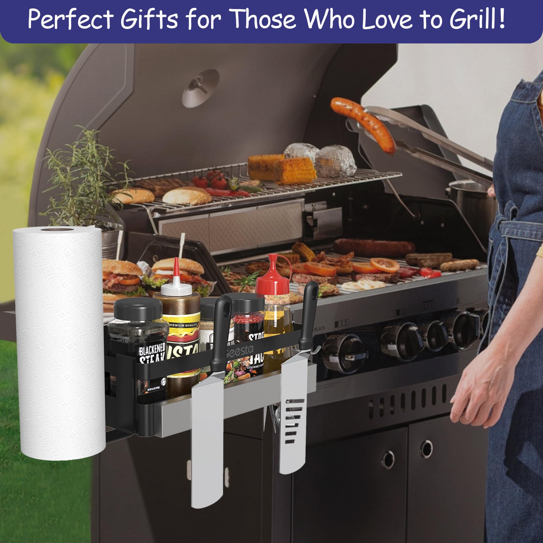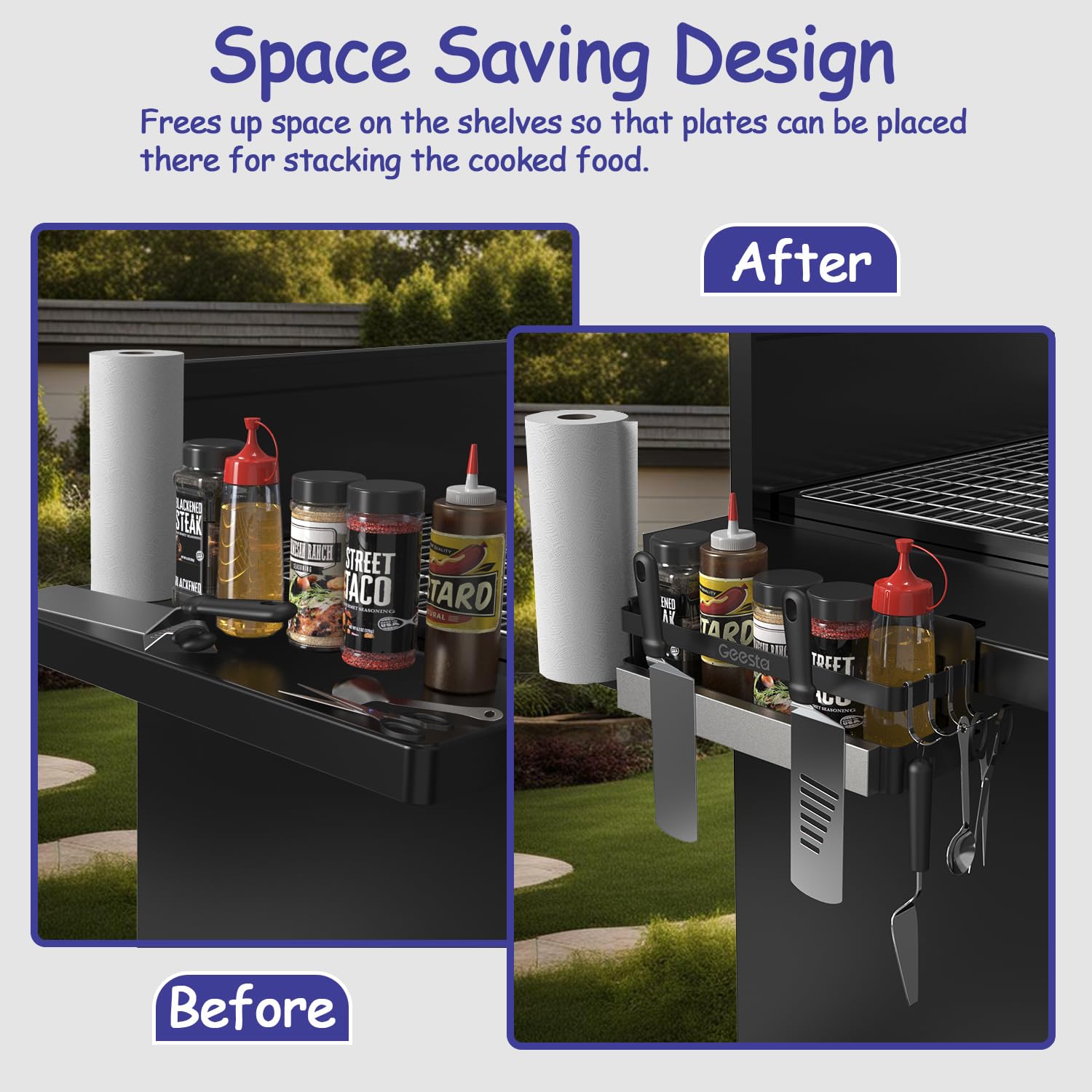 - 【Space Saving Design】This caddy organizer is a nice way to increase the usable space on your Blackstone grill, free up your counter space to place your cutting board, plates and more food. It keeps sauces, oil bottle, condiments, grill utensils, and paper towels organized and within reach without taking up much space. It is now so much easier to cook because you don't need to not constantly looking for something and no longer knock over bottles of sauce.