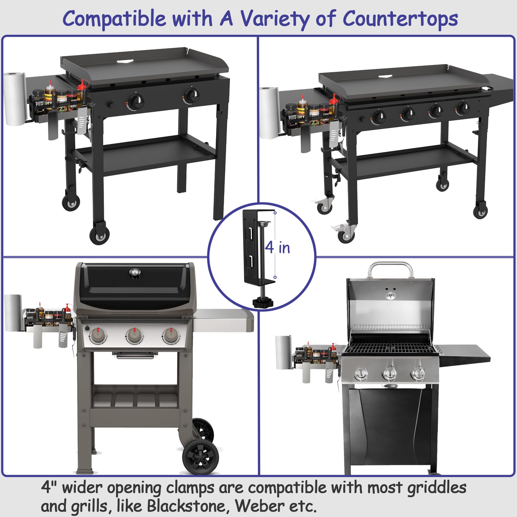 - 【Compatible with A Variety of Countertops】Designed with an upgraded 4' wider opening clamps, this griddle tool holder matches countertops up to 4' thick. It's compatible with most griddles and grills, like 28/36 inches Blackstone griddles, Weber grill, tabletop and prep cart etc. No tools, no drilling, simply clamp it on and your all set! Good quality and now all is in reach. It is a great gift for those who love to grill!