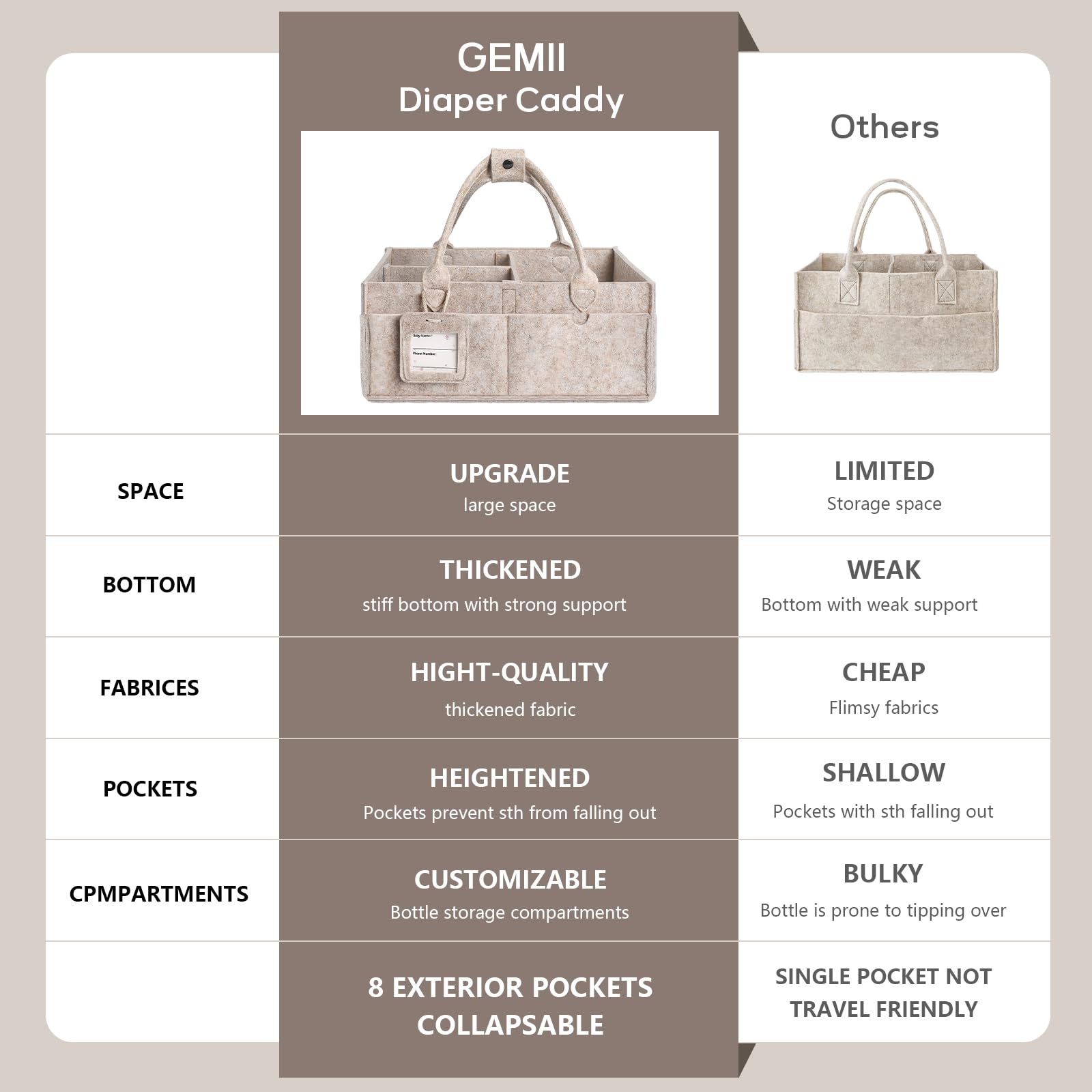 - THOUGHTFUL BABY SHOWER GIFT: The GEMII diaper caddy is a practical and adorable baby shower gift that the style and color works great for boys and girls. The diaper organizer help them stay organized from day one with this must-have newborn essential. offering new parents a stylish and organized solution for diaper changing. It would make a perfect baby shower gift for an expectant mother.