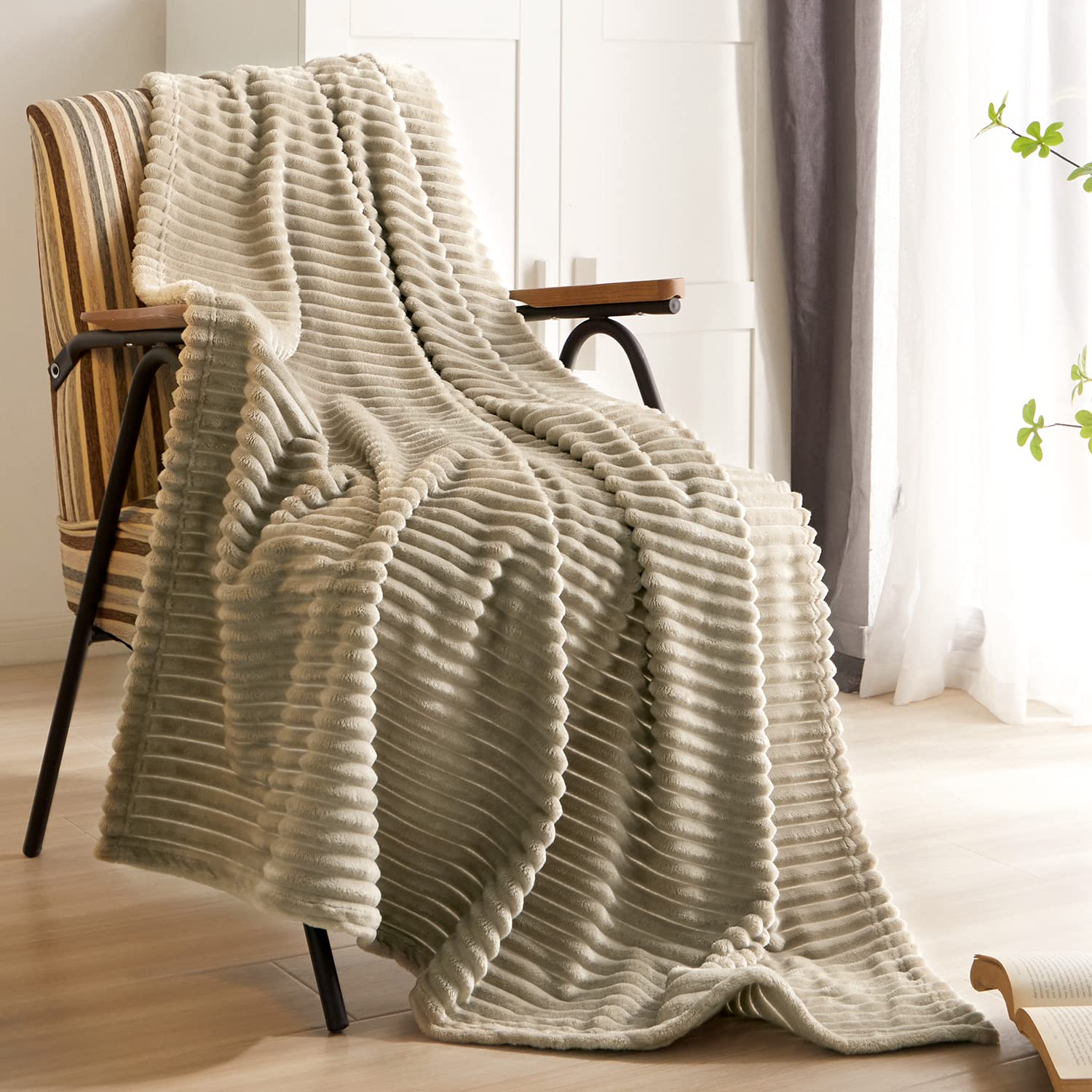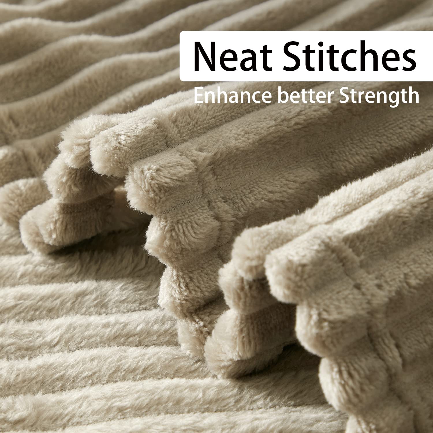 Geniospin Fleece Blanket Queen Size – 280GSM Super Soft Lightweight Bed Blanket with Strip, 3D Ribbed Jacquard, Plush Fuzzy Cozy Microfiber, Warm and Breathable (Taupe, 90x90 inches)