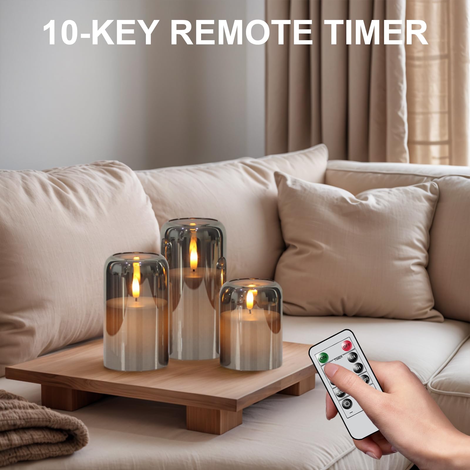 GenSwin Glass LED Candles with Remote Timer, Black Flameless Candles Battery Operated with Flickering Flame, Glass and Real Wax Pillar Candle for Halloween Christmas Home Decor(Set of 3, D3”x4”5”6”)