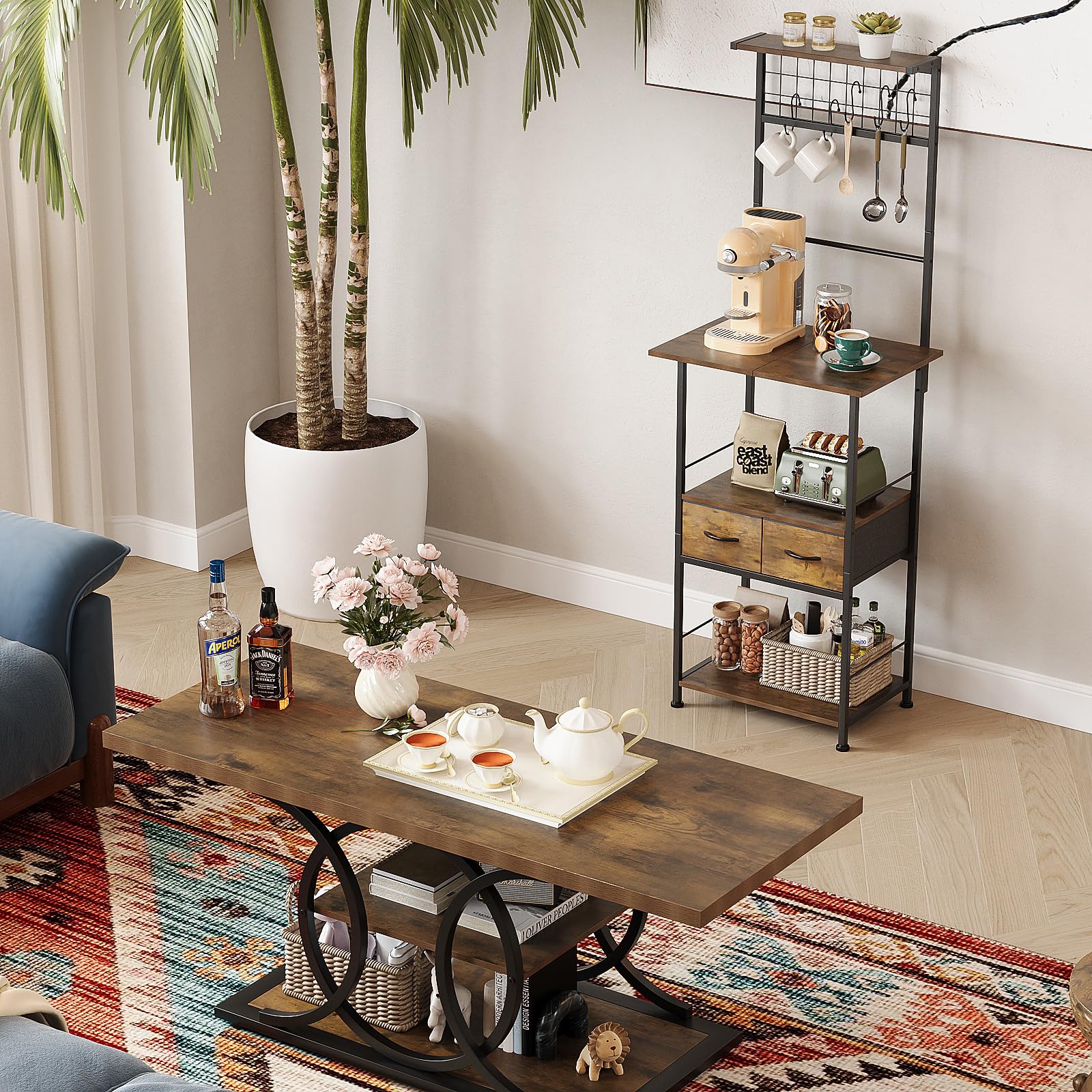 - Ample Storage Space: This coffee bar with 4 layers shelves and 2 fabric drawers is an ideal choice for your coffee corner. What's more, with 5 S-shaped hooks and pegboard, it is convenient to hang coffee cups and baking utensils, keeping your coffee corner neat, organized, and easy to access.