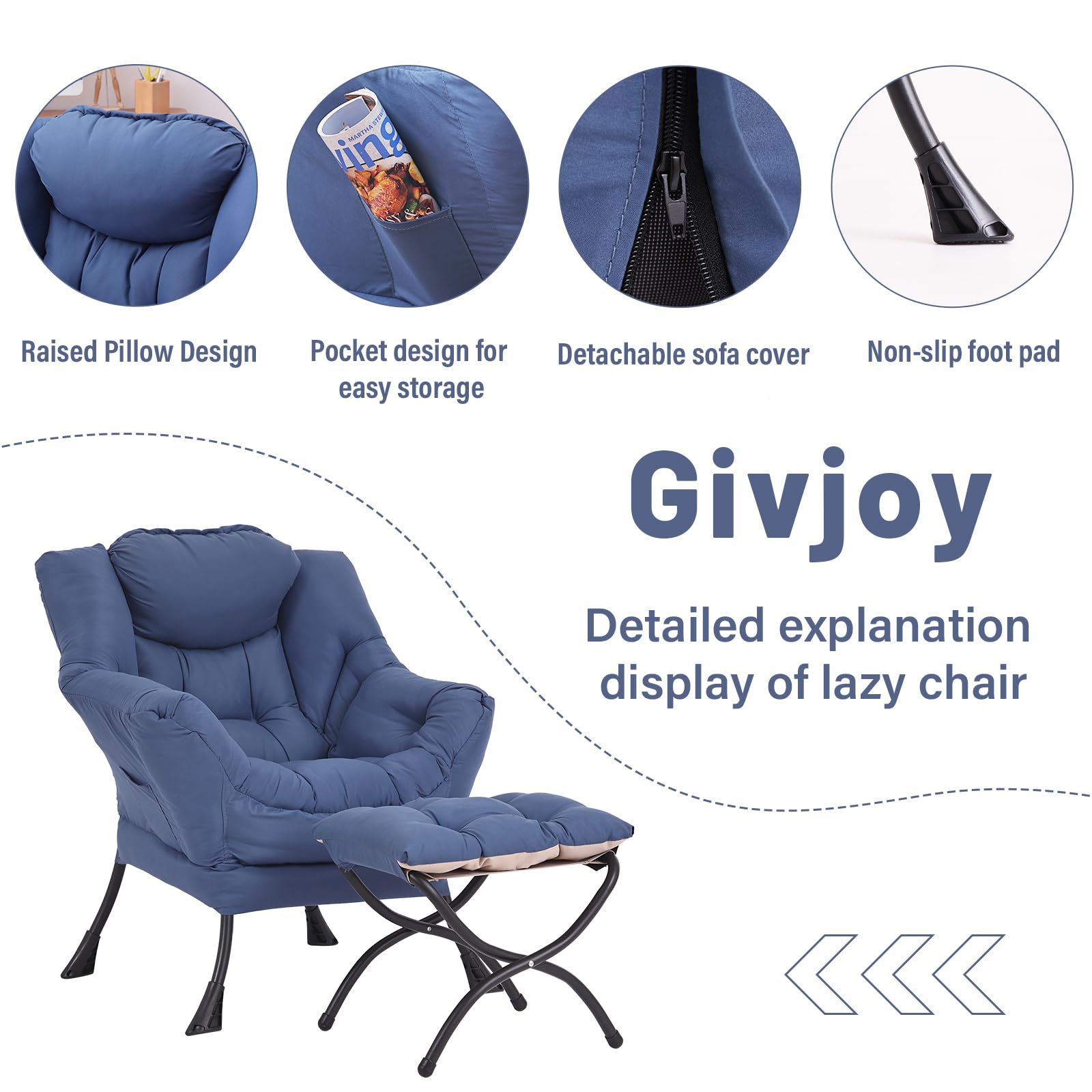 Givjoy Lazy Chair and Ottoman, Large Accent Lounge Chair with Armrests and a Side Pocket, Modern Leisure Upholstered Sofa Reading Armchair with Footrest for Bedroom, Living Room, Dorm Rooms, Office