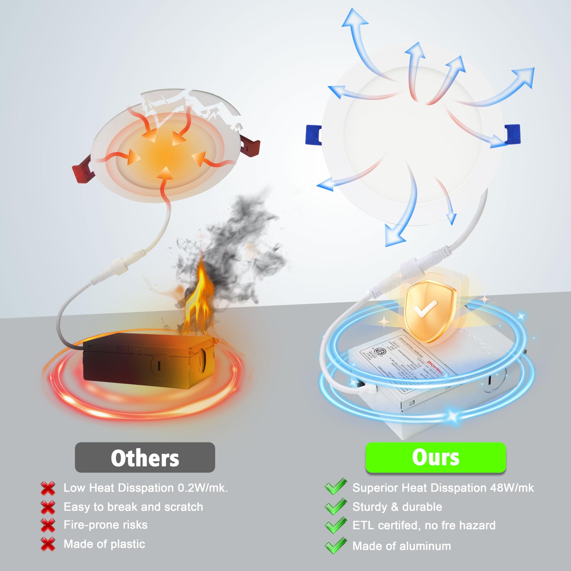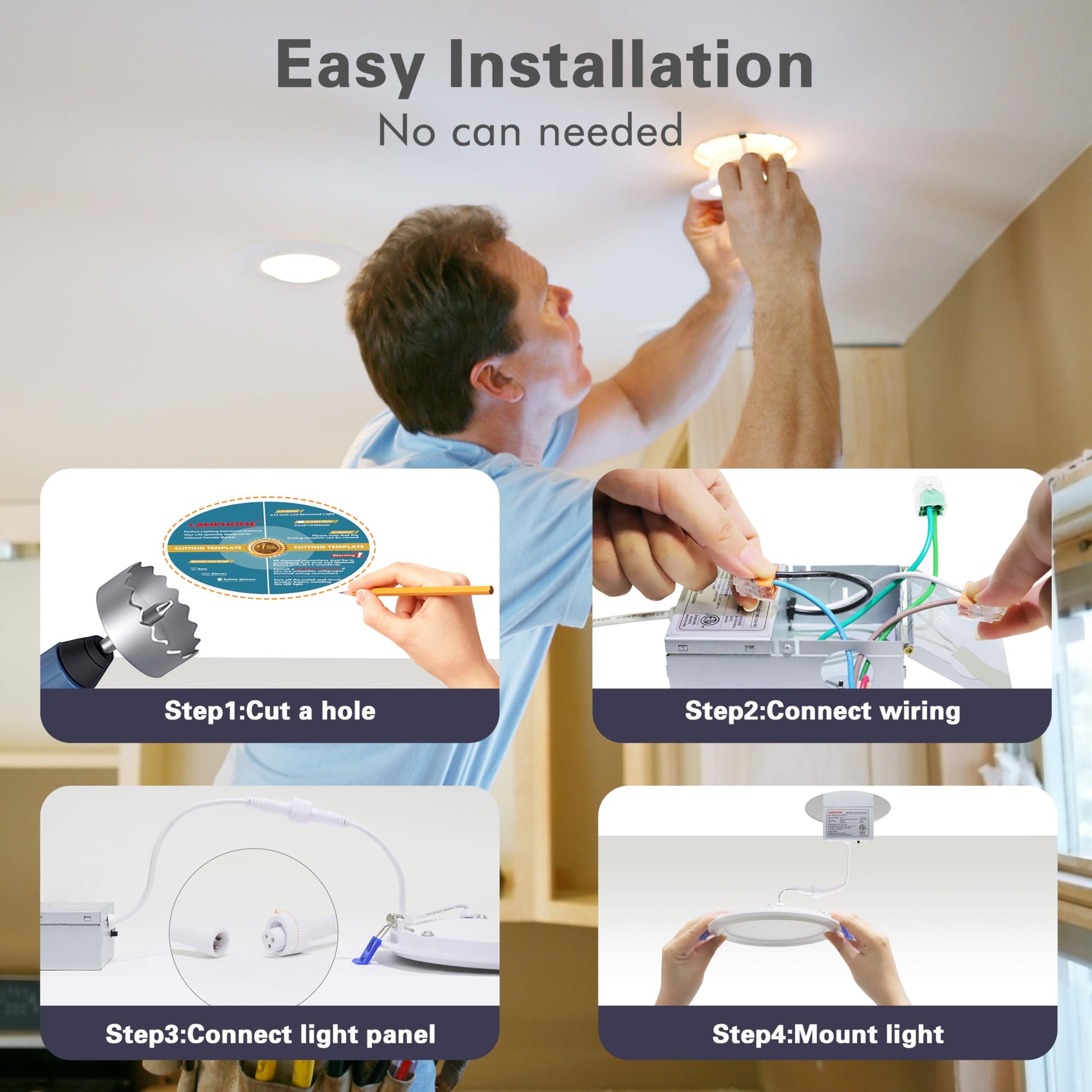 Details: 5-in-1 Color Temperature Adjustment GLOWNOVA's LED recessed lights offer a 5-in-1 color temperature selection, ranging from 2700K to 5000K. This allows you to effortlessly customize the lighting to match your room's ambiance. You can avoid the hassle of product returns or exchanges due to mismatched color temperatures. Simply slide the switch on the side of the J-box to select the ideal color temperature for your space. IC-Rated Safety GLOWNOVA's canless LED recessed lights are IC-rated, ensuring they can be safely installed in direct contact with ceiling insulation. This provides thermal protection and insulation compatibility, with a minimal 2-inch ceiling space requirement. This reduces the risk of fire hazards in various ceiling and overhead joist installations. Effortless Installation GLOWNOVA's recessed lighting is designed for both retrofit and new construction projects. With a low profile and a 1:1 hole template for precise cutting, installation is straightforward. Connect the J-box to the cable and secure it with a spring clip. The entire process can be completed in minutes, making it a hassle-free solution for your lighting needs. Energy-Efficient Brightness The 8-inch slim pot lights utilize the world's leading LED chips, delivering a high lumen output of 1600LM while consuming only 18 Watts. This results in significant energy savings, equivalent to an 88-90% reduction in energy costs compared to traditional halogen lamps, all while maintaining optimal brightness levels. 5-Year Warranty and Superior Customer Support GLOWNOVA stands behind its products with a comprehensive 5-year warranty. All recessed lighting solutions are ETL certified, ensuring high-quality standards. Our dedicated customer support team is committed to addressing your concerns within 12 hours, ensuring your satisfaction with GLOWNOVA's lighting solutions.