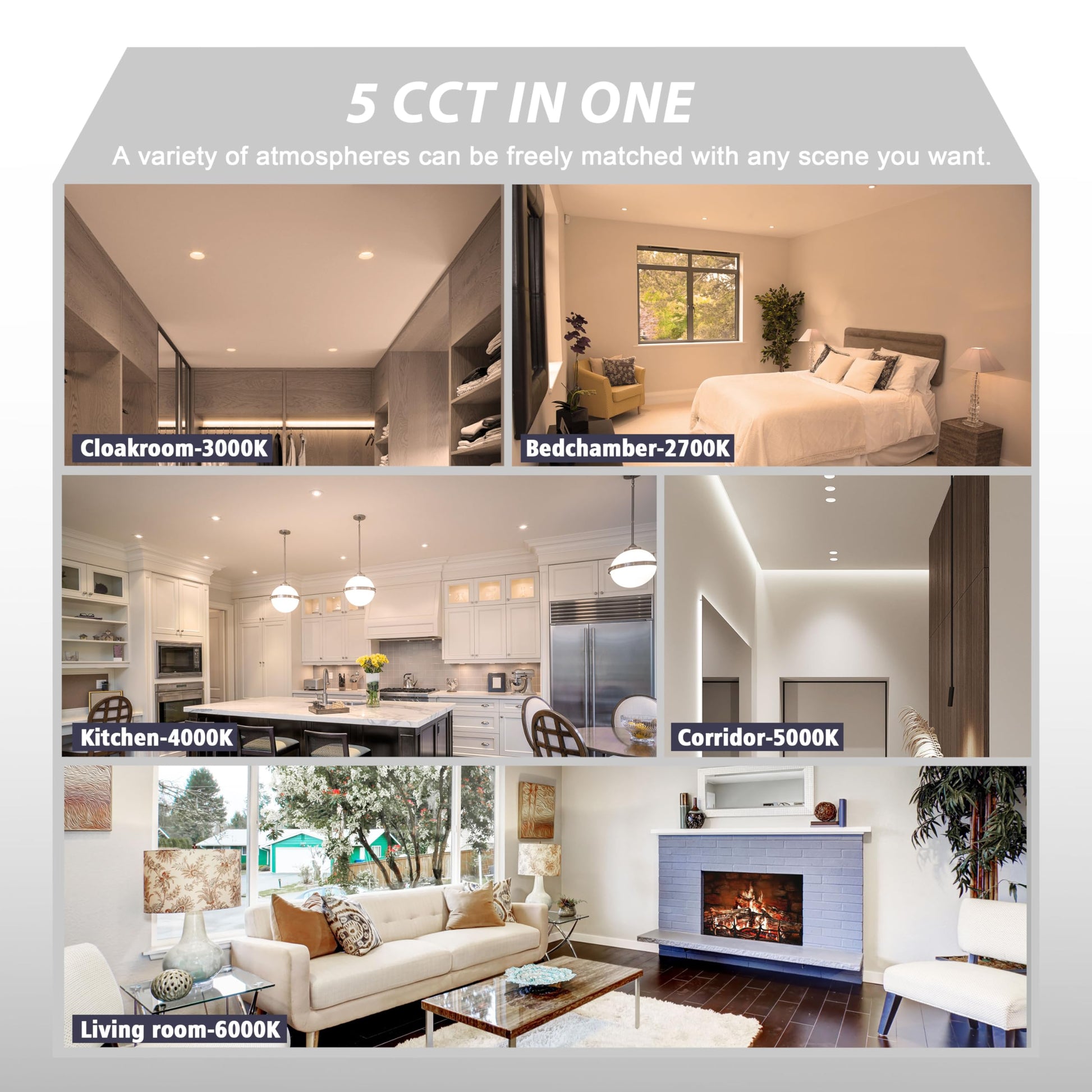 - 5-in-1 Color Temperature Adjustment GLOWNOVA's LED recessed lights offer a 5-in-1 color temperature selection, ranging from 2700K to 5000K. This allows you to effortlessly customize the lighting to match your room's ambiance. You can avoid the hassle of product returns or exchanges due to mismatched color temperatures. Simply slide the switch on the side of the J-box to select the ideal color temperature for your space.