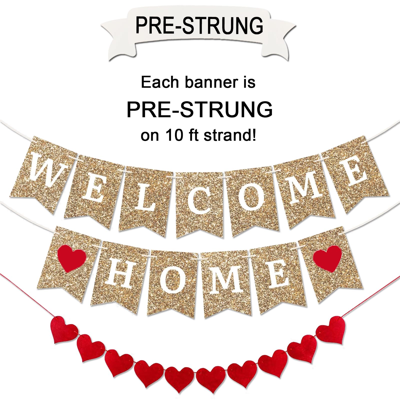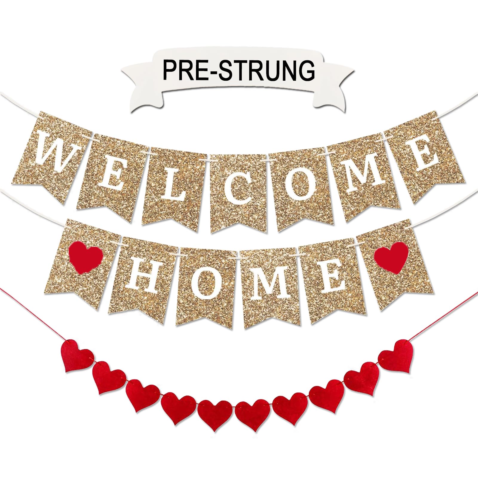 Welcome Home Banner: No setup needed! Each letter is carefully strung on durable 8-foot ribbon strands, ready for you to hang in your favorite spot.