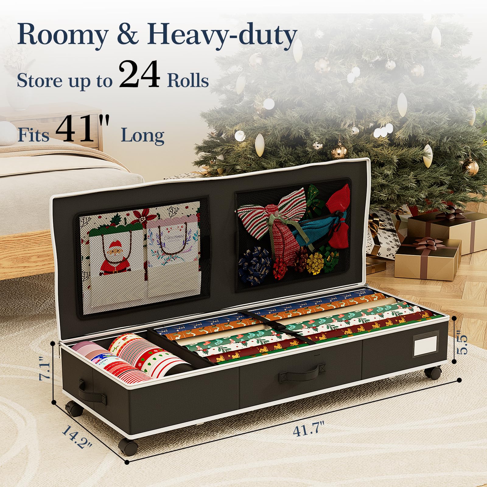 GoMaihe Wrapping Paper Storage with Wheels: Fits 41" Under-bed Gift Wrap Organizer & Container for Christmas Ribbon Accessories | Pockets & Adjustable Dividers | Easy Pull-out | Heavy-duty | Black