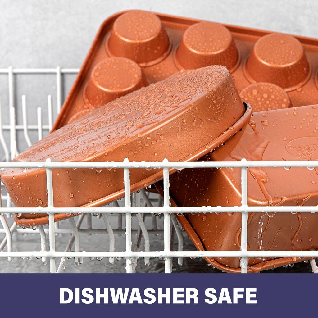 Details: Gotham Steel 5 Piece Complete Copper Nonstick Bakeware Set with Durable Ceramic Coating, Heavy Duty 0.8MM Gauge, Dishwasher Safe, Includes XL Cookie Sheet, Muffin Pan, Baking Pan, Loaf Pan & Round Baking Tray