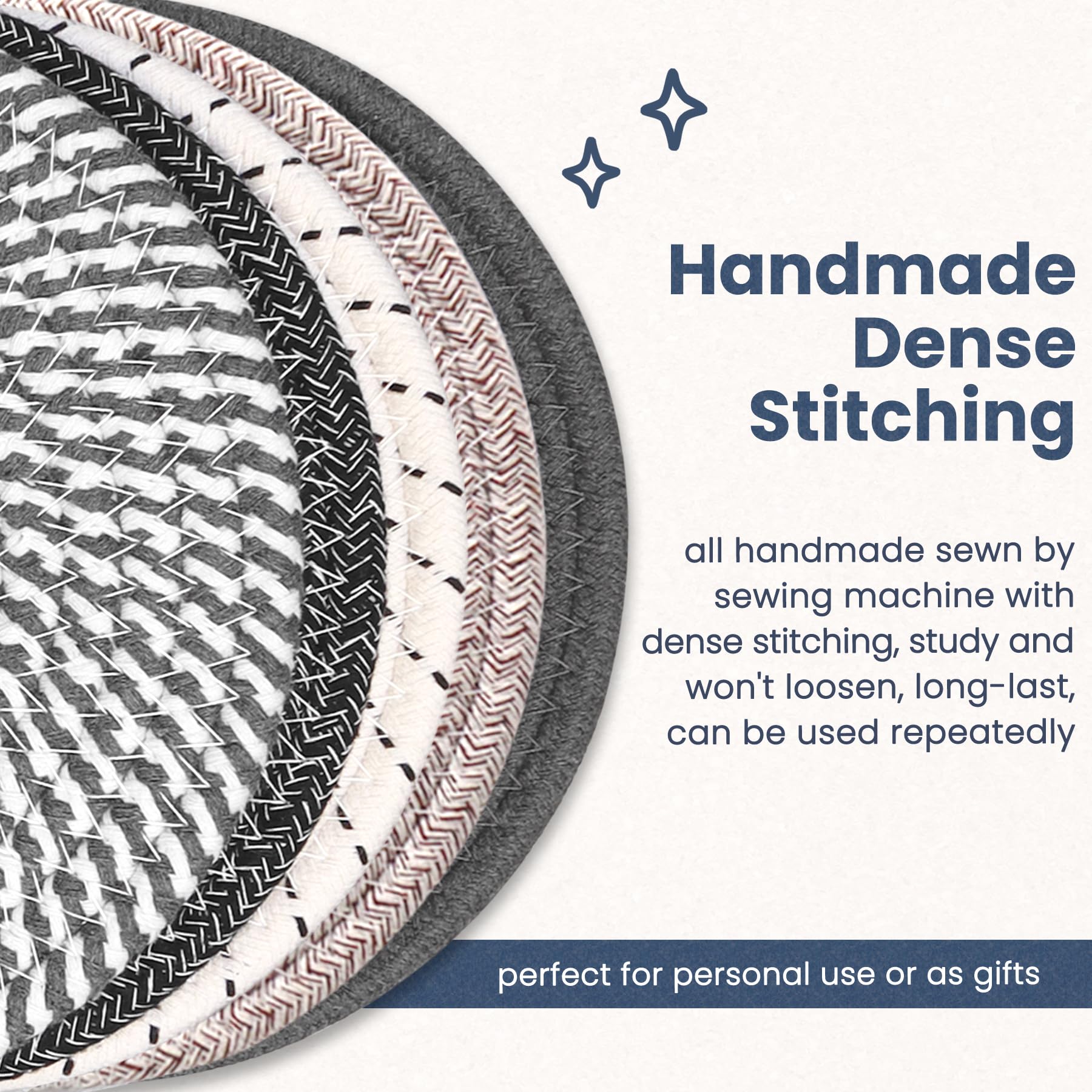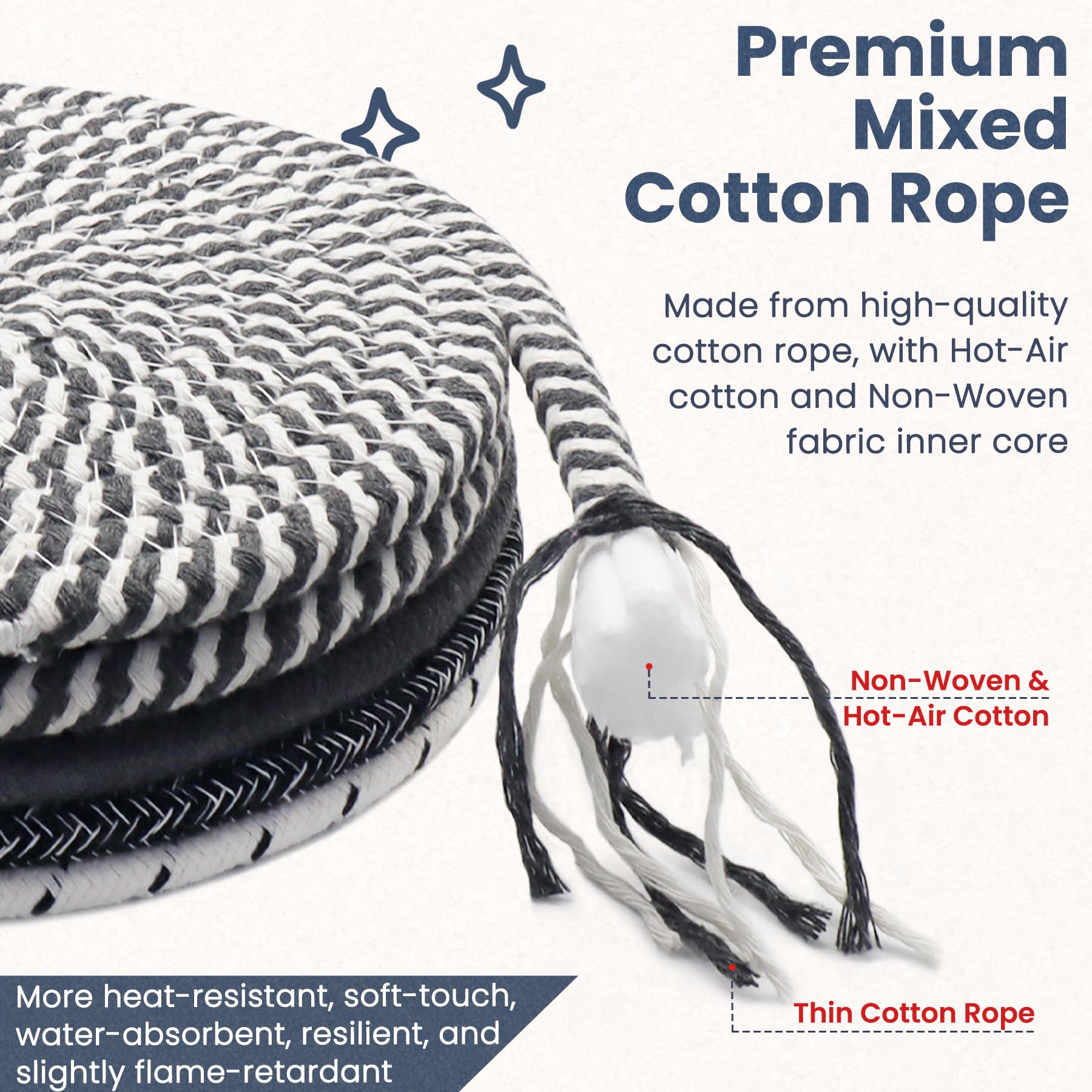 - Premium Fabric: Our heat trivets are made from high-quality cotton ropes, featuring premium Hot-Air cotton and inner Non-Woven fabric. They are heat-resistant, soft-touch, water-absorbent, resilient, and slightly flame-retardant. The thickened kitchen trivets are tightly woven with dense stitching, ensuring they don't loosen and can be used repeatedly