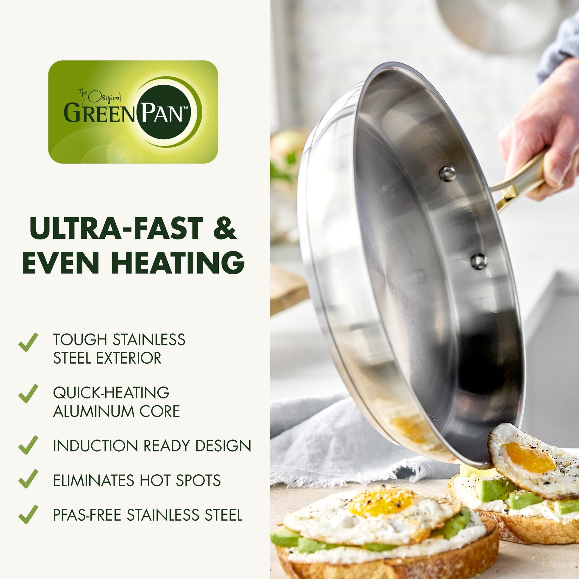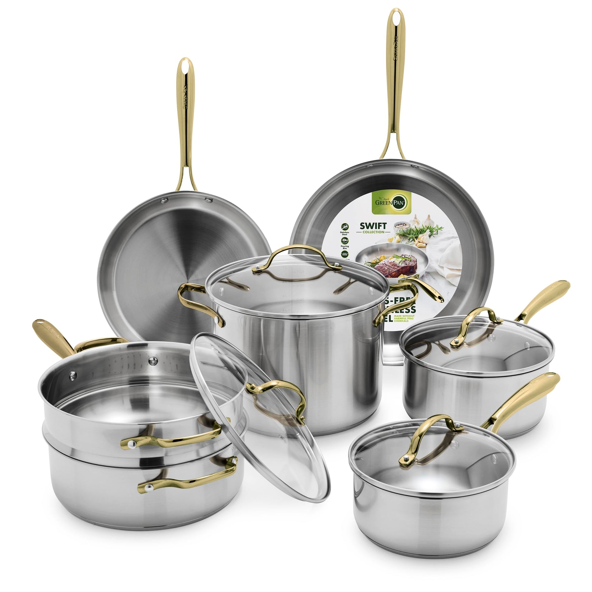 GreenPan 11 Piece Stainless Steel Cookware Set, Induction Ready, Tri-Ply Multiclad Pots & Pans with Lids, Compatible on All Cooktops, Measurement Markings, Dishwasher & Oven Safe, Swift, Gold Handles