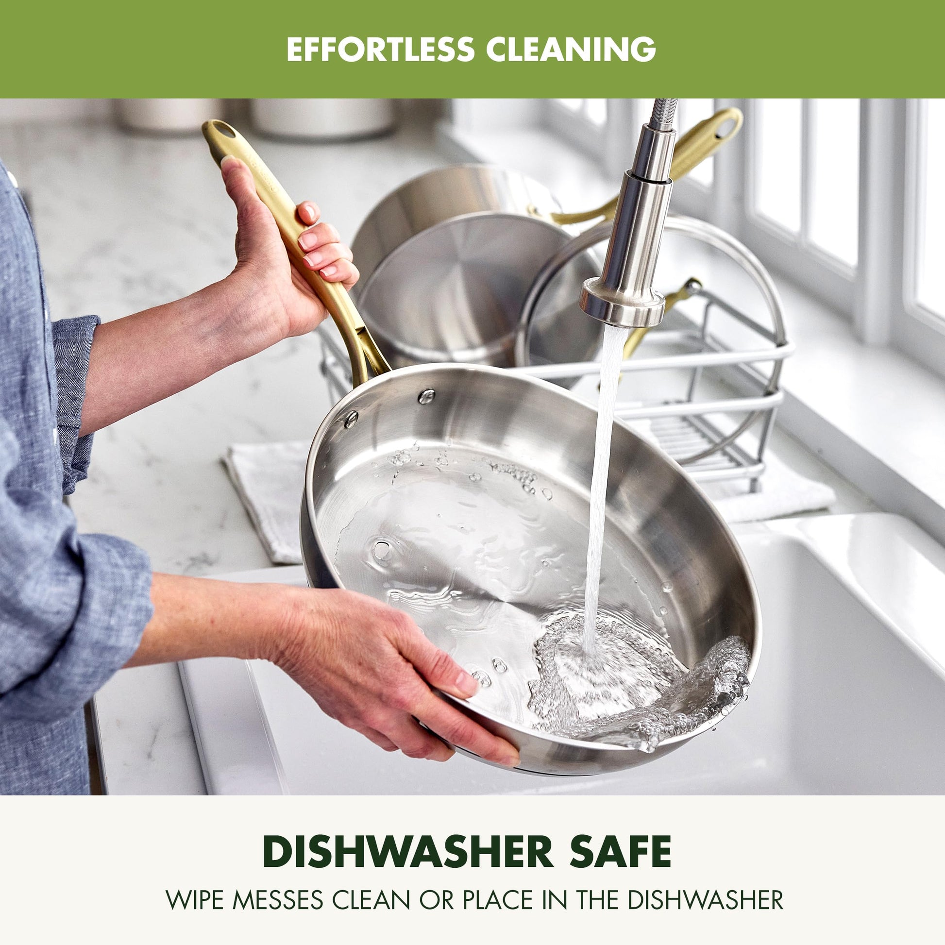 Details: Crafted with ultra-durable stainless steel, this cookware ensures years of reliable performance. The layered stainless steel base with an aluminum core provides quick and even heating, eliminating hot spots for perfect results. The set is oven and broiler safe up to 600°F (lids up to 425°F) and works on all stovetops, including induction. The riveted mirror-polished stainless steel handles offer a secure, stay-cool grip for safe handling. Tempered glass lids help retain heat, moisture, and flavor while allowing you to monitor cooking without lifting the lid. For easy cleanup, the set is dishwasher safe, though hand washing is recommended. GreenPan Swift is built for both durability and performance, ideal for everyday cooking.