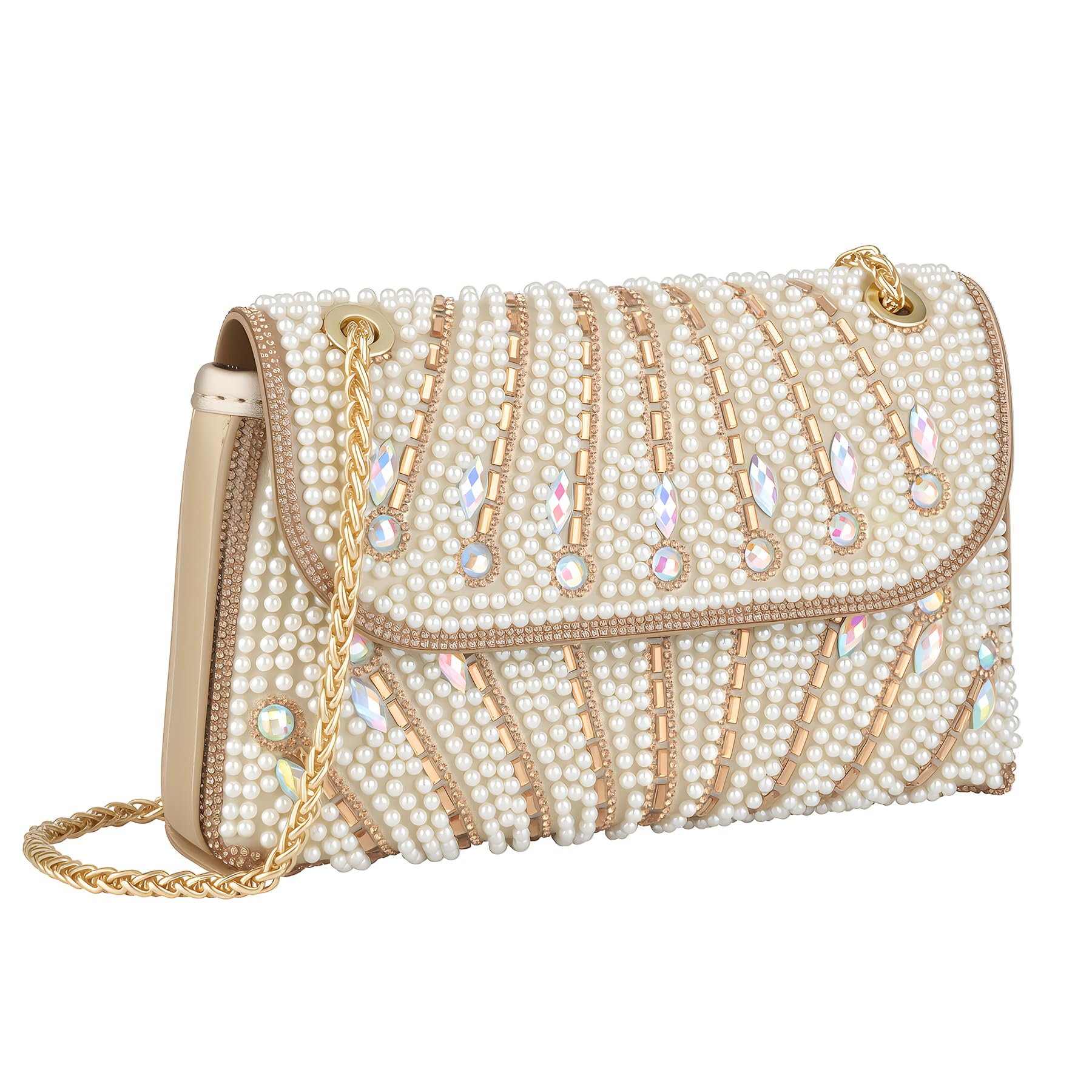 - Made with a wallet style design, come with an adjustable strap for easy carrying. Adorned with dazzling pearls and rhinestones for a touch of extra sparkle.