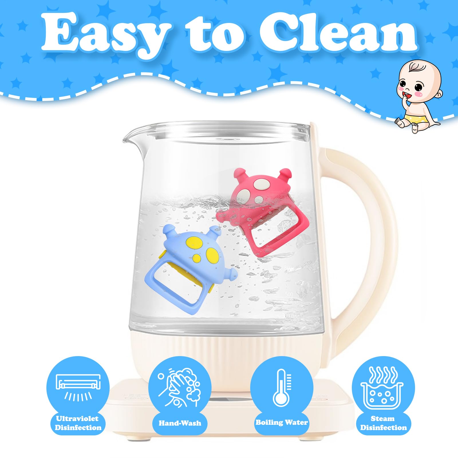 - [Easy to Clean] This teething toy is resistant to high and low temperatures and is very easy to clean. You can wipe down the surface, hand wash it, put it in boiling water or in the refrigerator, or wash it with a food grade neutral detergent. (Note: please clean the teether before first use.)