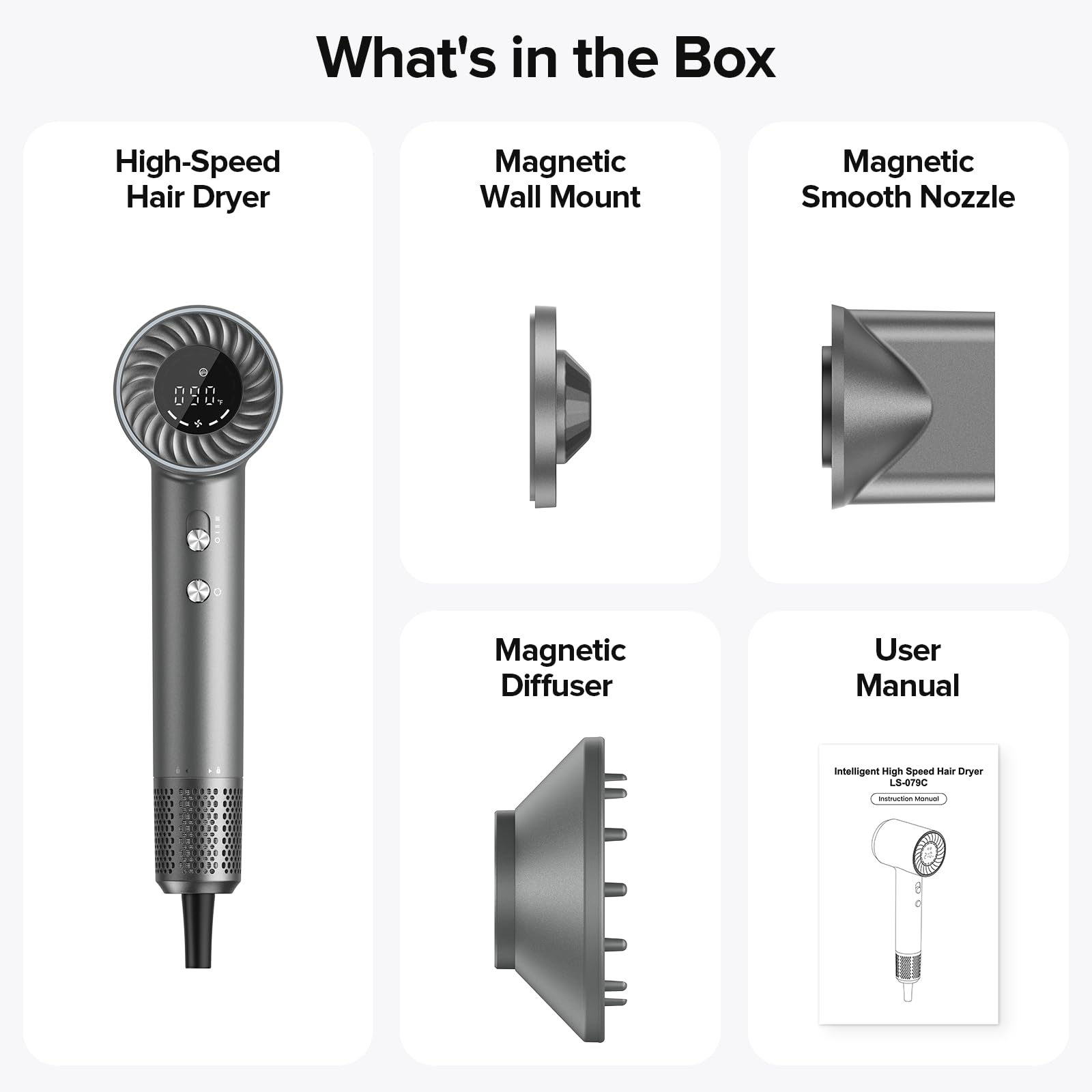 - Magnetic Attachments: Includes an air nozzle for precise styling and a diffuser for curly hair. 360° rotating magnetic design ensures secure attachment.