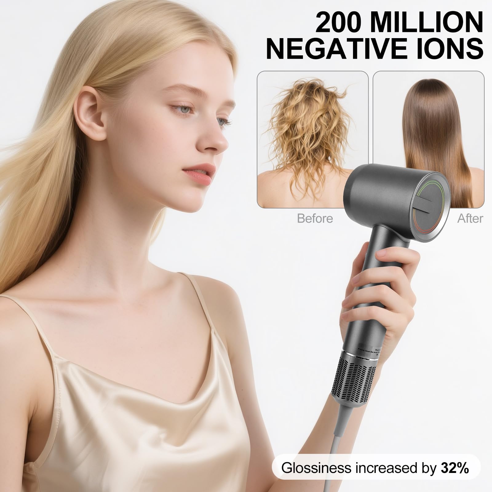 - 【200 Million Negative Ions – Frizz-Free, Shiny Hair】 Equipped with a built-in ion generator, the dryer releases up to 200 million negative ions per cm³, reducing static and frizz while locking in moisture. Say goodbye to flyaways and hello to smoother, shinier, and healthier-looking hair every time you style.
