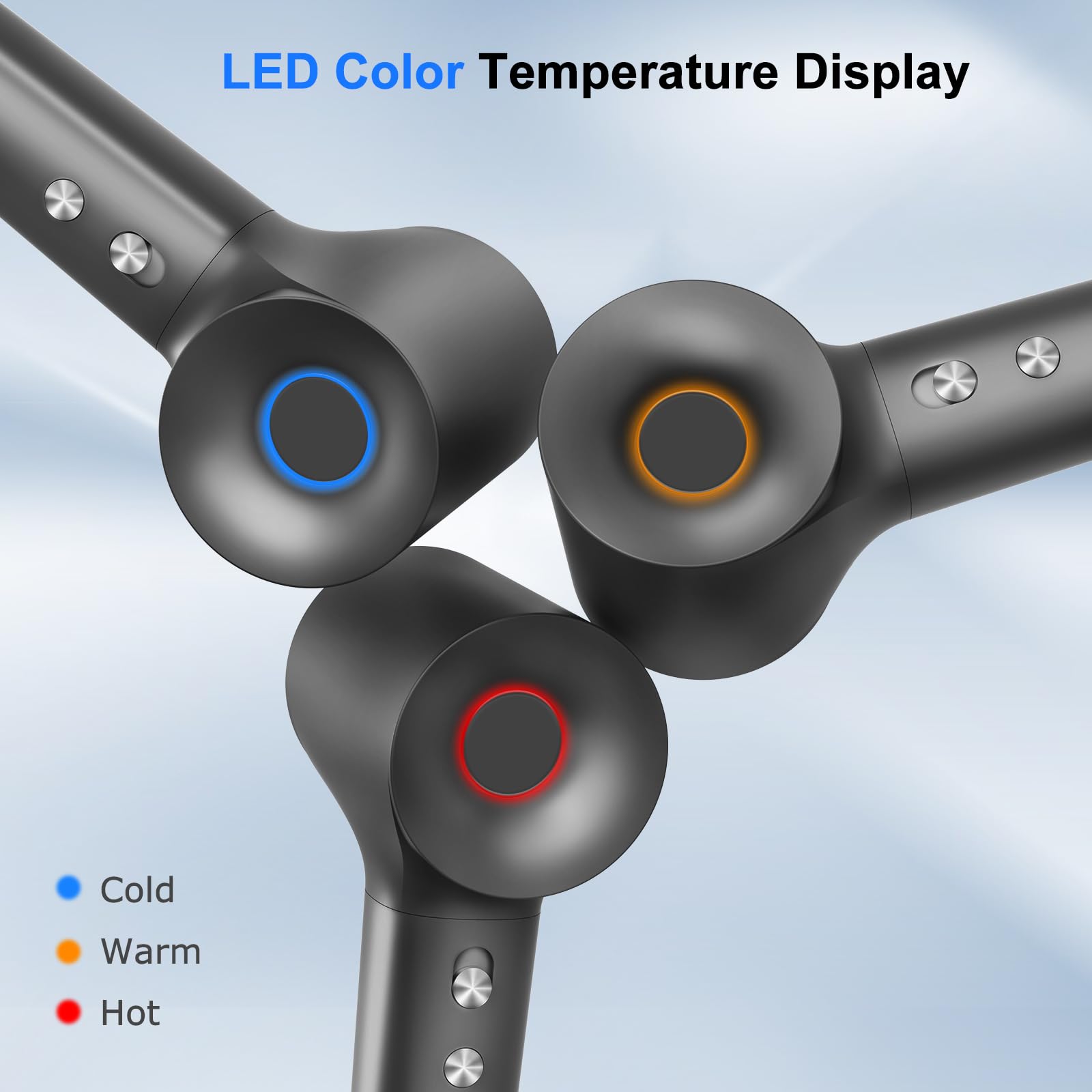 - Smart Tri-color LED Ring Light Design:The three colors displayed on the circular LED ring correspond to the temperature settings of the hairdryer. Red means 78 degrees (hot air), yellow means 49 degrees (warm air), blue means cold air. Press and hold the button for two seconds to activate the intelligent circulation mode, which alternates hot and cold air every few seconds to prevent extreme heat from damaging your hair.