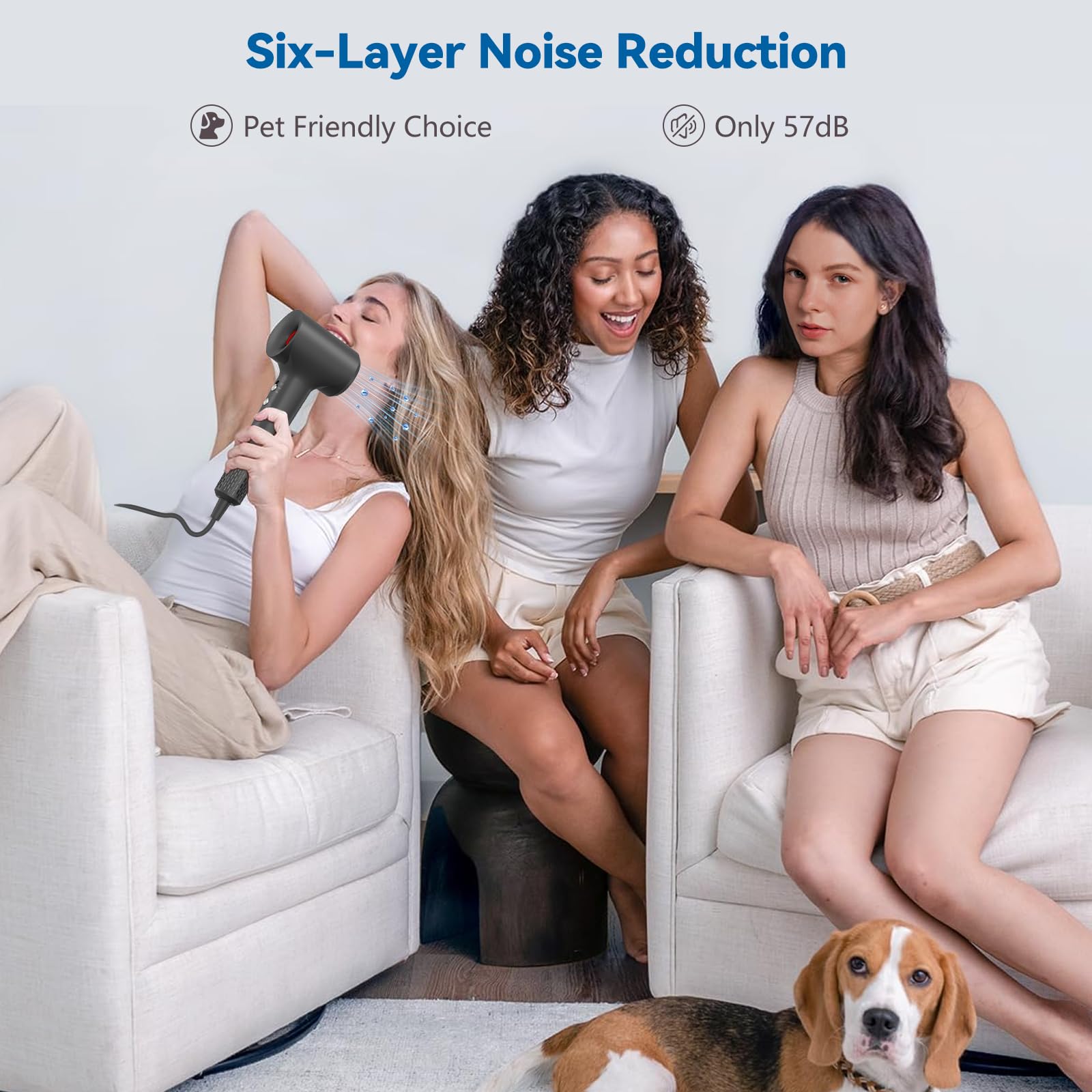 - Low Noise and Light Weight:Our hair dryer weighs only 0.89 lb. Small, portable and ergonomically designed, it's perfect for home and travel use. Although the hair dryer has a powerful motor and wind speed, it operates at only 57 decibels. Late night hair drying won't disrupt your family's sleep.