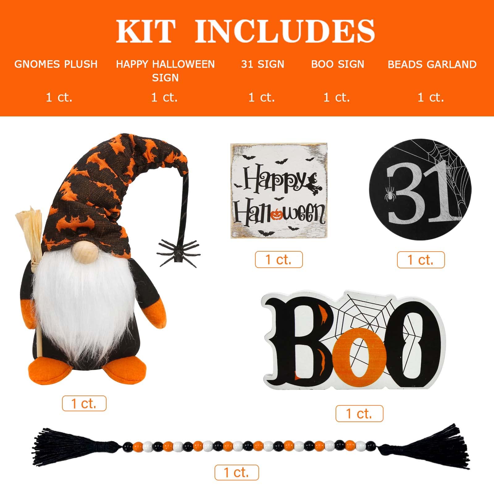 - This bundle set includes 3 wooden Halloween signs, cute gnomes plush and bead garland. (tiered tray NOT included)