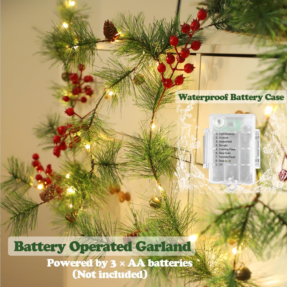 HamiFinee Christmas Garland with LED Fairy Lights Battery Operated Smokey Pine Garlands with 8 Flash Modes and Timer Red Berries Bells Pine Cones Green Garland Rustic Garlands for Xmas Holiday Home