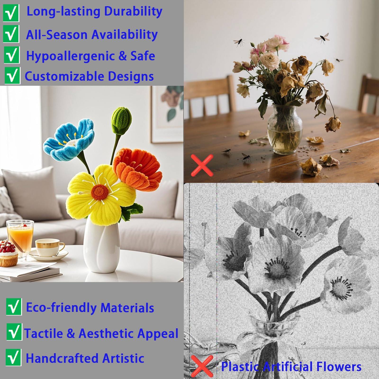 Handmade Artificial Flowers Kit with Ceramic Vase - Poppy Pipe Cleaner Bouquet for Wedding Centerpiece, Preserved Flowers Home Decor (Lasts 3-5 Years | Reshape Upon Arrival).