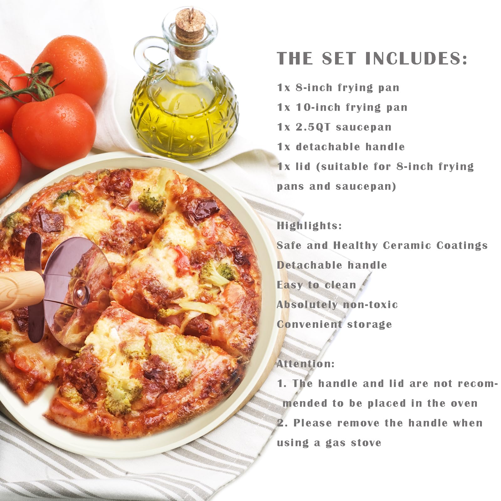 - Set includes: 1x 8-inch frying pan, 1x 10-inch frying pan, 1x 2.5QT saucepan, 1x detachable handle, 1x lid (suitable for 8-inch frying pans and saucepan)