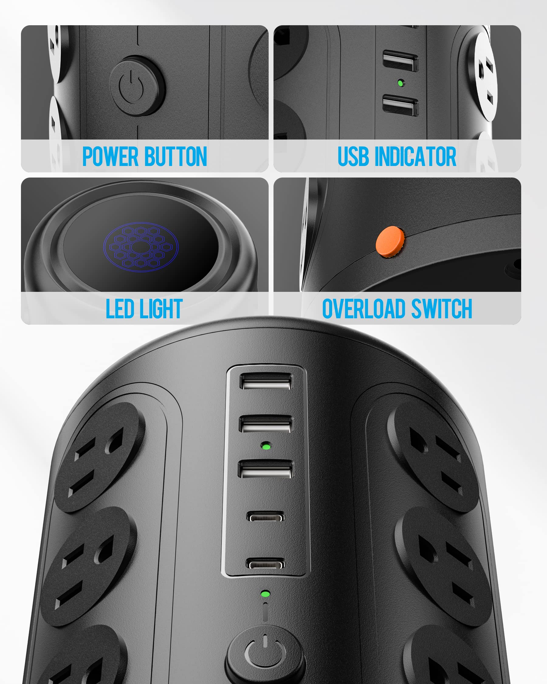 - 【21 in 1 Power Strip Tower】 With 16 AC outlets 3 USB-A ports and 2 USB-C ports, TenTrend outlet tower can simultaneously charge for 21 electric devices.