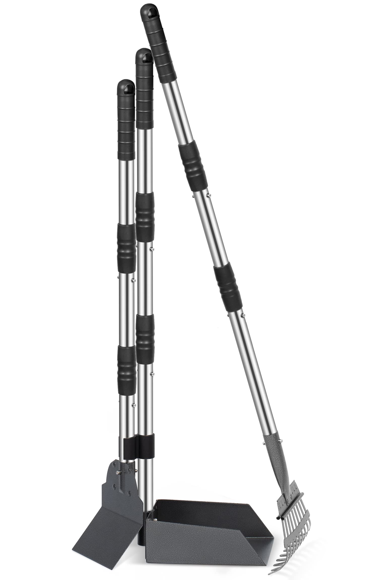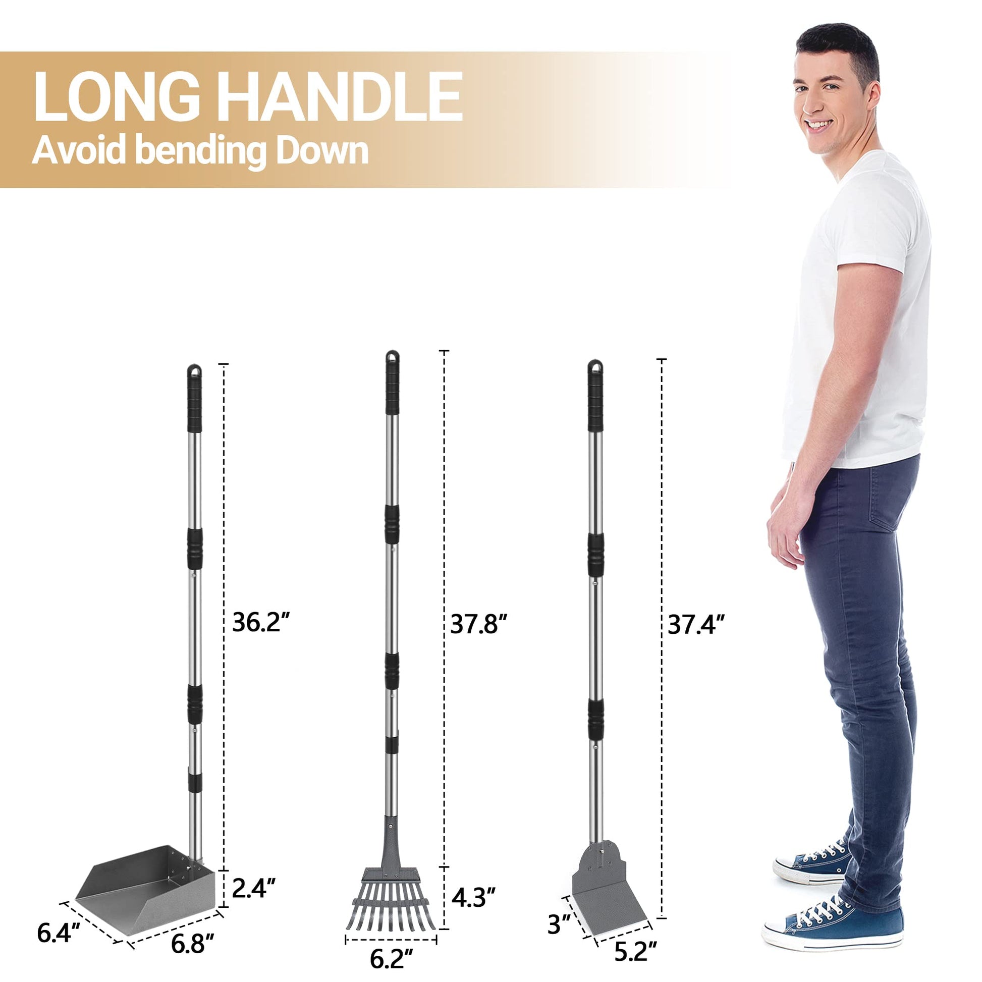 - Pooper Scooper Equipment in Pack: 1 tray, 1 spade and 1 rake kit, meet almost all the needs of using. The size is over 37 inches, you need not bend over when clean pet poop.