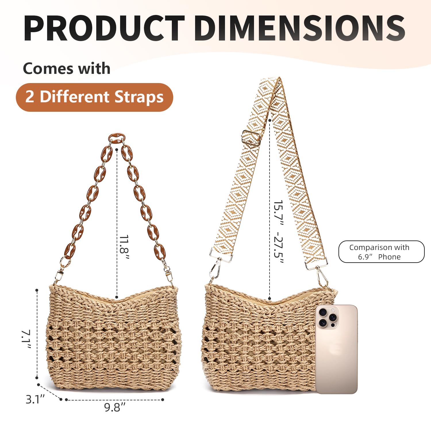- [Straw Crossbody Purse with 2 Removable Multicolor Strap]: The design with replacement colorful shoulder web wide guitar strap and chain strap makes the retro pocketbooks distinctive. It can be use a hand bags, clutch, underarm bags, shoulder bags or cross body bags according the actual need.