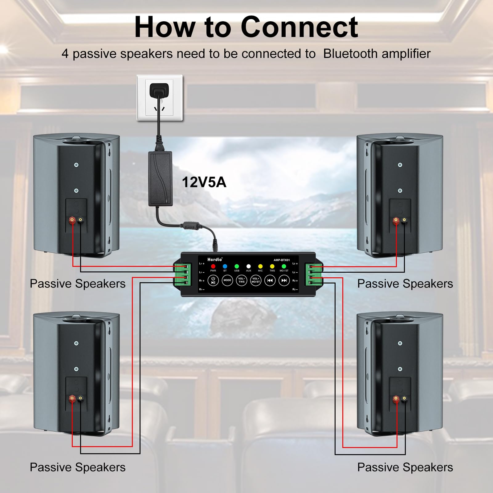 Herdio 5.25 Inch 600W Outdoor Bluetooth Speakers Waterproof Wired Wall Mount Weatherproof Loudspeaker System for Indoor- Outdoor Garden Poolside Patio Garage Home(4 Speakers,Black)