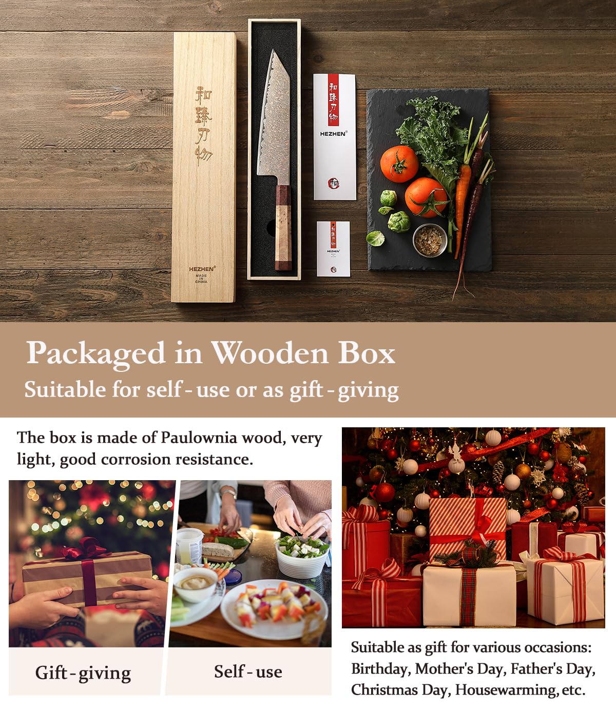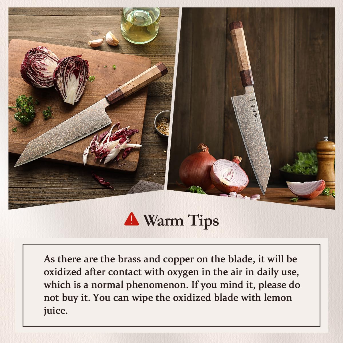 - Packaged in a lightweight and corrosion-resistant paulownia wood box, this kiritsuke chef knife is perfect for gifting or personal use; Note that the brass and copper on the blade may oxidize over time when exposed to air—simply wipe with lemon juice to restore its shine; For any questions, our customer service team is here to assist you