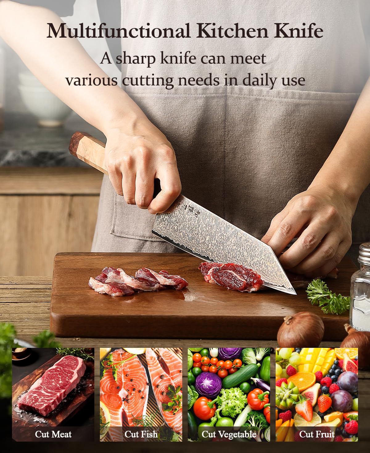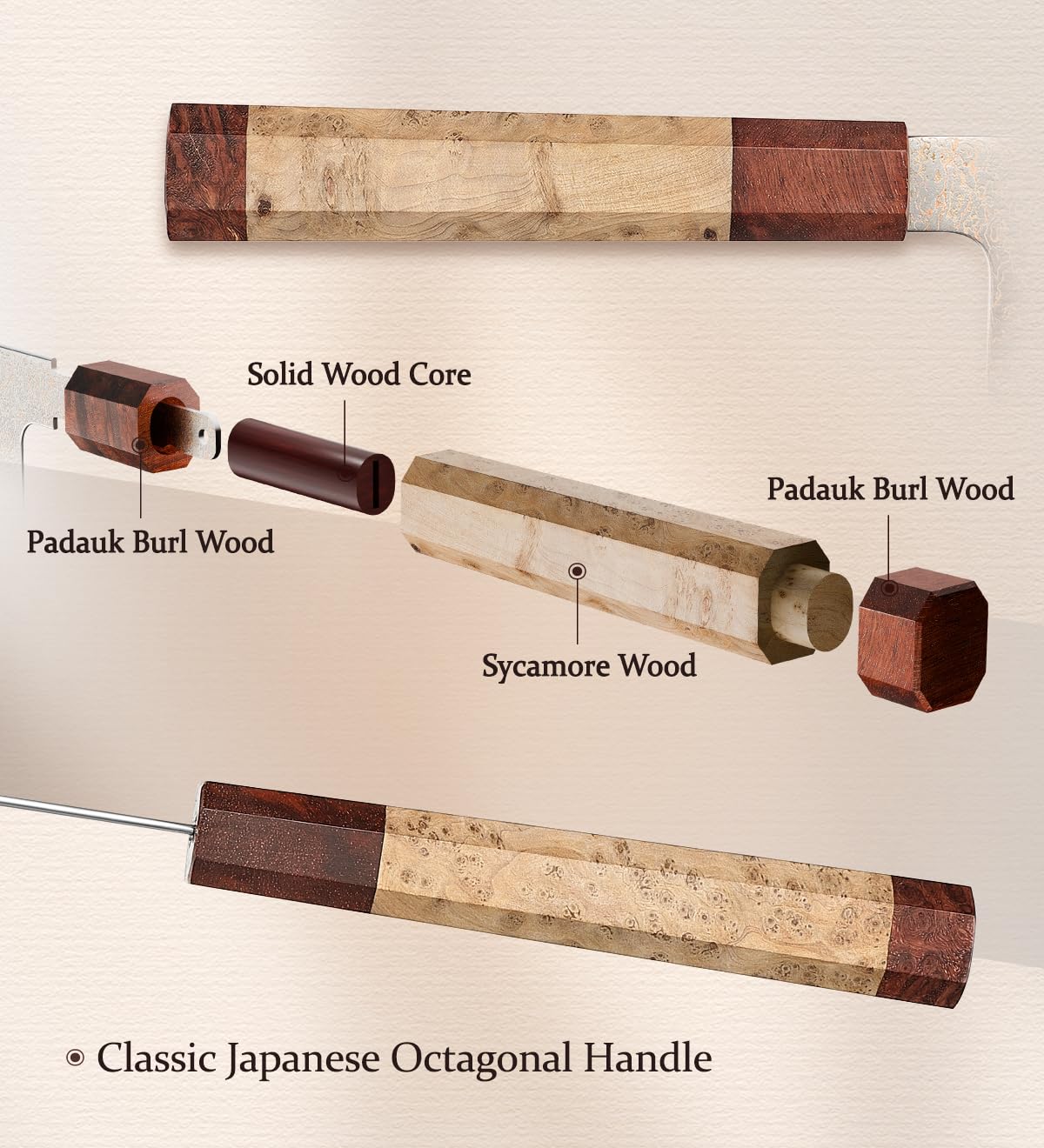 - Featuring a classic Japanese octagonal handle made of figured sycamore wood and padauk burl wood, this chef knife combines ergonomic comfort with timeless elegance; The natural wood grain ensures a secure grip, making it ideal for extended use while adding a touch of sophistication to your kitchen