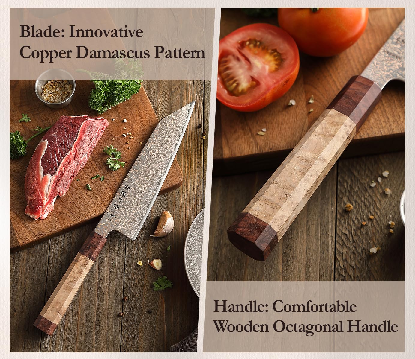 - Crafted with 37 layers of tricolor copper Damascus steel with 12Cr18MoV steel core, this chef knife offers exceptional durability and a stunning visual appeal; Perfect for professional chefs and cooking enthusiasts, the intricate Damascus pattern ensures both strength and beauty in every slice; Elevate your kitchen tools with this high-performance copper Damascus steel knife